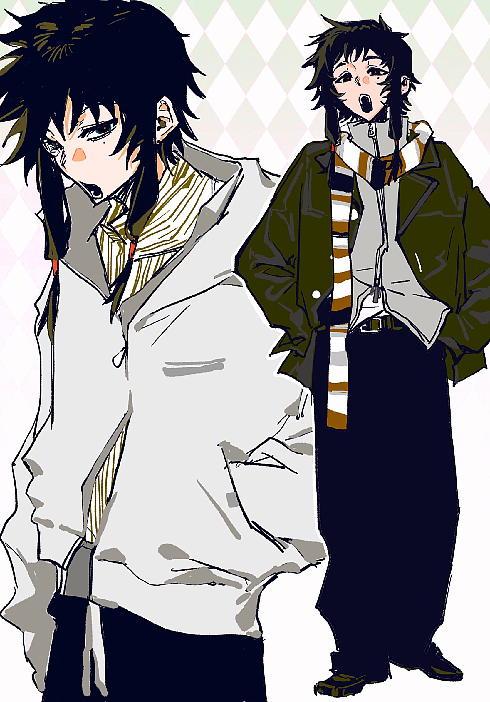 1boy alternate_costume argyle_background bijiaoxihuantanxian black_eyes black_hair black_pants chinese_commentary commentary_request full_body green_jacket grey_jacket hands_in_pockets high_collar highres jacket long_sleeves male_focus mole mole_under_eye multiple_views open_clothes open_jacket open_mouth pants red_pupils scarf shirt short_hair_with_long_locks striped_clothes striped_scarf touqi_guaitan white_jacket white_shirt ziche_fuzhao zipper