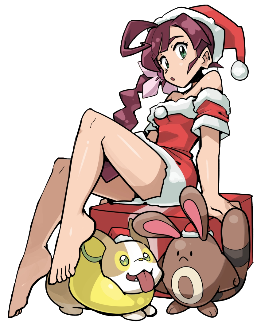 1girl alternate_costume bag barefoot chloe_(pokemon) christmas dress flower gen_2_pokemon gen_8_pokemon green_eyes hair_flower hair_ornament long_hair looking_at_viewer maroon_hair nintendo open_mouth pokemon pokemon_(anime) pokemon_(creature) pokemon_journeys santa_costume santa_dress sbql_(niaunclefan) sentret side_ponytail sitting smile third-party_edit toes yamper