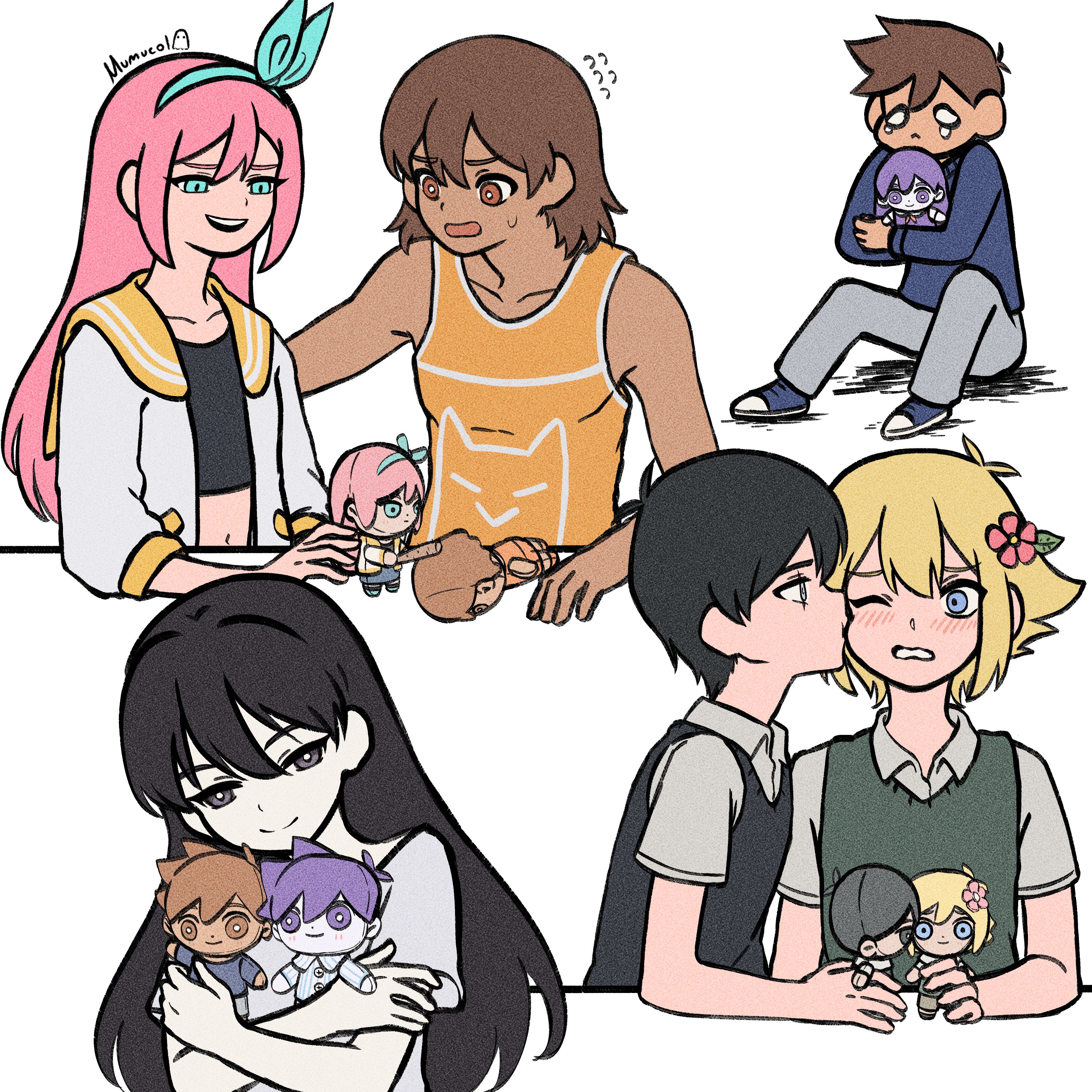 2girls 4boys absurdres aubrey_(faraway)_(omori) aubrey_(omori) basil_(faraway)_(omori) basil_(omori) black_eyes black_hair black_sweater_vest blonde_hair blue_eyes blue_footwear blue_hairband blue_sweater blush bright_pupils brown_eyes brown_hair character_doll closed_mouth collarbone collared_shirt colored_skin crop_top crossed_arms crying crying_with_eyes_open dark-skinned_male dark_skin doll dress flower flying_sweatdrops green_sweater_vest grey_eyes grey_pants hair_flower hair_ornament hairband hero_(faraway)_(omori) hero_(headspace)_(omori) hero_(omori) highres holding holding_stuffed_toy jacket kel_(faraway)_(omori) kel_(omori) kiss kissing_cheek long_hair long_sleeves looking_at_another looking_at_viewer mari_(faraway)_(omori) mari_(headspace)_(omori) mari_(omori) mari_(spirit)_(omori) multiple_boys multiple_girls mumucol navel omori one_eye_closed open_mouth pants pink_hair scar scar_across_eye scar_on_face shirt shoes short_hair short_sleeves smile sneakers spoilers stuffed_toy sunny_(omori) sweatdrop sweater sweater_vest tears teeth upper_teeth_only white_dress white_jacket white_pupils white_shirt white_skin yaoi