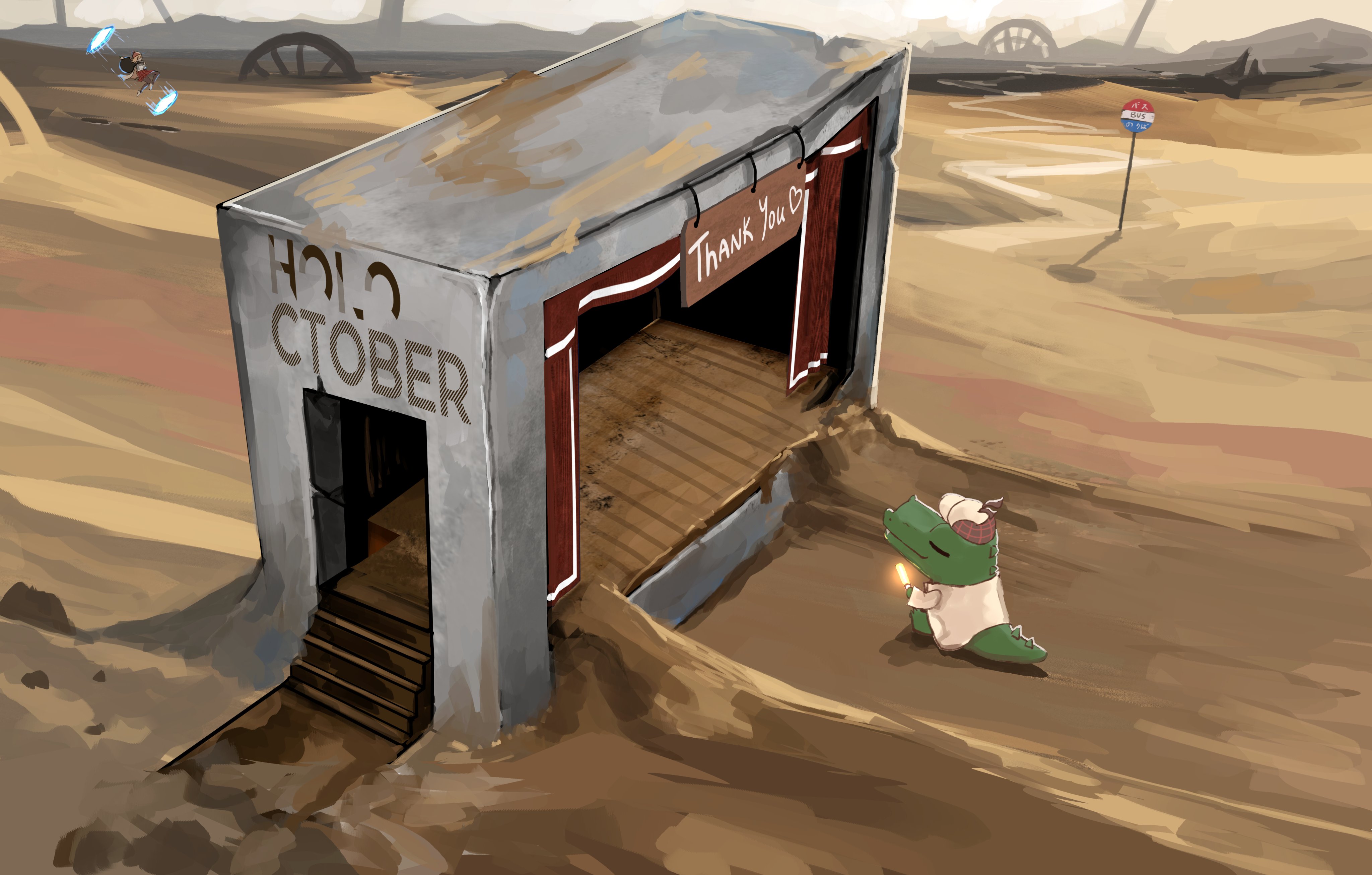 1girl absurdres advarcher alligator brown_hair brown_jacket bus_stop bus_stop_sign closed_eyes commentary crocodilian curtains deerstalker desert english_commentary english_text glowstick hat highres holding holding_glowstick hololive hololive_english investigator_(watson_amelia) jacket outdoors penlight_(glowstick) portal_(object) ruins sand sign sitting smile solo_focus stage stage_curtains virtual_youtuber watson_amelia watson_amelia_(1st_costume)