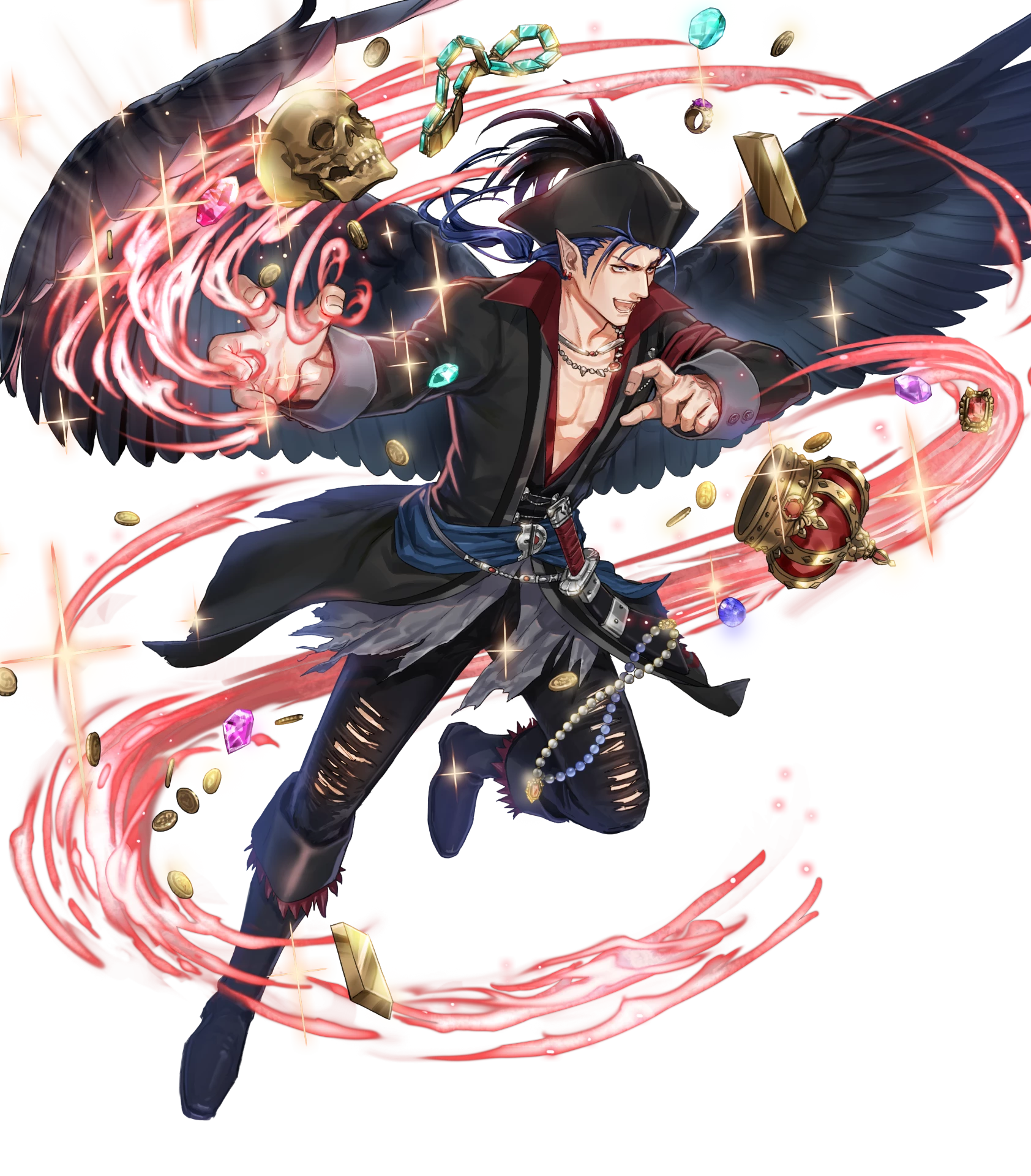1boy aqua_gem black_wings blue_eyes blue_gem blue_hair boots coin crown earrings fire_emblem fire_emblem:_radiant_dawn fire_emblem_heroes full_body gem gold_bar gold_coin hat highres jewelry kuroba.k laguz_(fire_emblem) long_hair low_neckline male_focus naesala_(fire_emblem) naesala_(pirate)_(fire_emblem) naesala_(sea's_shadow)_(fire_emblem) necklace nintendo non-web_source official_art open_mouth pants pearl_necklace pendant pirate_hat pointy_ears ponytail purple_gem red_gem sash skull solo torn_clothes torn_pants transparent_background unworn_crown unworn_jewelry unworn_necklace waist_sash wings
