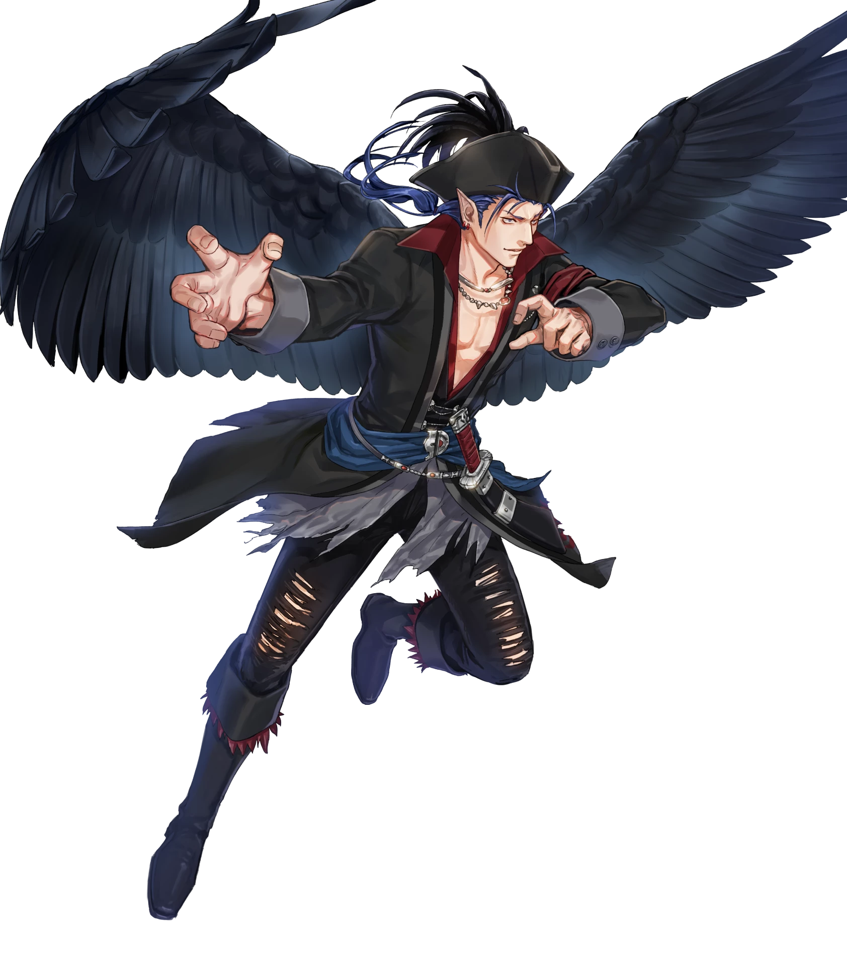 1boy black_wings blue_eyes blue_hair boots earrings fire_emblem fire_emblem:_radiant_dawn fire_emblem_heroes full_body hat highres jewelry kuroba.k laguz_(fire_emblem) long_hair low_neckline male_focus naesala_(fire_emblem) naesala_(pirate)_(fire_emblem) naesala_(sea's_shadow)_(fire_emblem) nintendo non-web_source official_art pants pirate_hat pointy_ears ponytail sash solo torn_clothes torn_pants transparent_background waist_sash wings