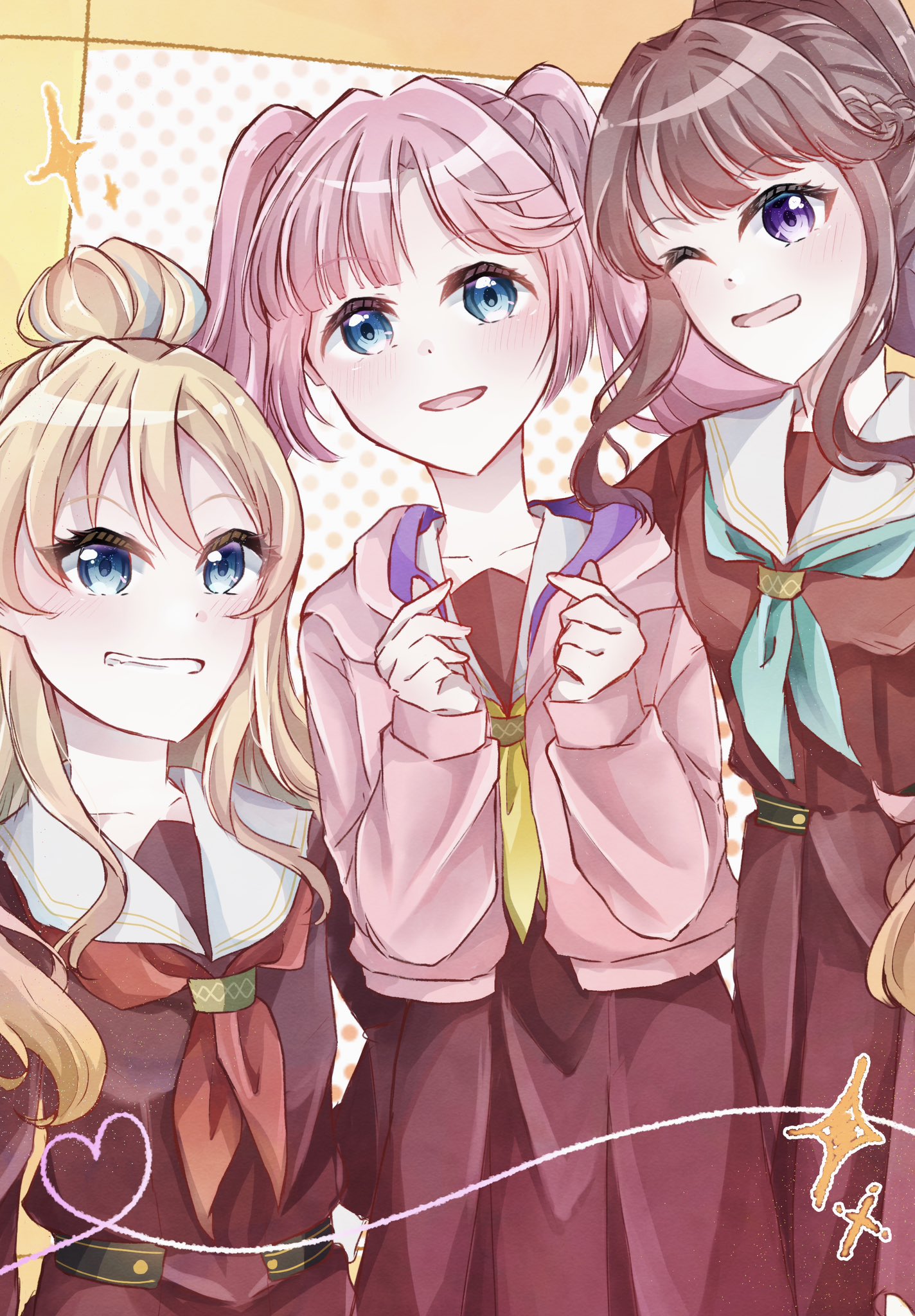 3girls :d ;d anyoji_hime aqua_neckerchief blonde_hair blue_eyes blue_hair blunt_bangs braid brown_dress brown_hair cowboy_shot double_finger_heart dress fanfare!!!_(love_live!) finger_heart fujishima_megumi gradient_hair grin hair_bun half_up_braid hasu_no_sora_school_uniform highres hood hooded_jacket jacket light_blue_hair link!_like!_love_live! long_hair long_sleeves looking_at_viewer love_live! mira-cra_park! multicolored_hair multiple_girls neckerchief official_alternate_hairstyle one_eye_closed open_clothes open_jacket open_mouth osawa_rurino pink_hair pink_jacket pleated_dress ponytail purple_eyes red_neckerchief sailor_collar sailor_dress school_uniform sidelocks single_hair_bun smile streaked_hair swept_bangs tumugi06hana twintails virtual_youtuber white_sailor_collar winter_uniform yellow_neckerchief