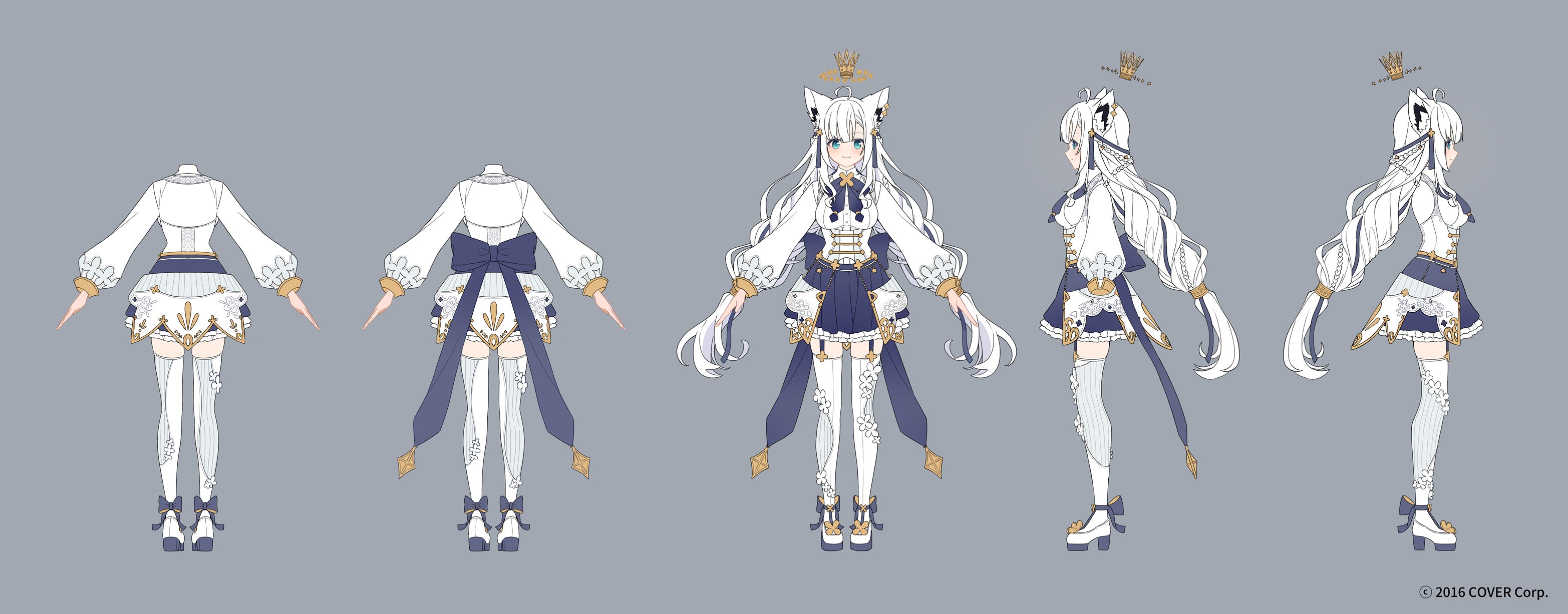 1girl ahoge animal_ear_piercing animal_ears aqua_eyes back_bow blue_ribbon blue_skirt bodice bow braid reference_sheet collared_shirt commentary_request copyright_notice crown floating_crown footwear_bow fox_ears fox_girl fox_tail frilled_skirt frills full_body gezerun gold_trim grey_background hair_ribbon high_heels highres hololive idol idol_clothes layered_skirt legwear_garter long_hair long_sleeves low-tied_long_hair low_twintails mini_crown miniskirt multiple_views neck_ribbon official_alternate_costume official_alternate_hairstyle official_art parted_bangs pentagram puffy_long_sleeves puffy_sleeves ribbed_thighhighs ribbon shirakami_fubuki shirakami_fubuki_(saint) shirt shirt_tucked_in sidelocks simple_background skirt strappy_heels tail thighhighs twintails very_long_hair virtual_youtuber waist_bow white_footwear white_hair white_shirt white_thighhighs