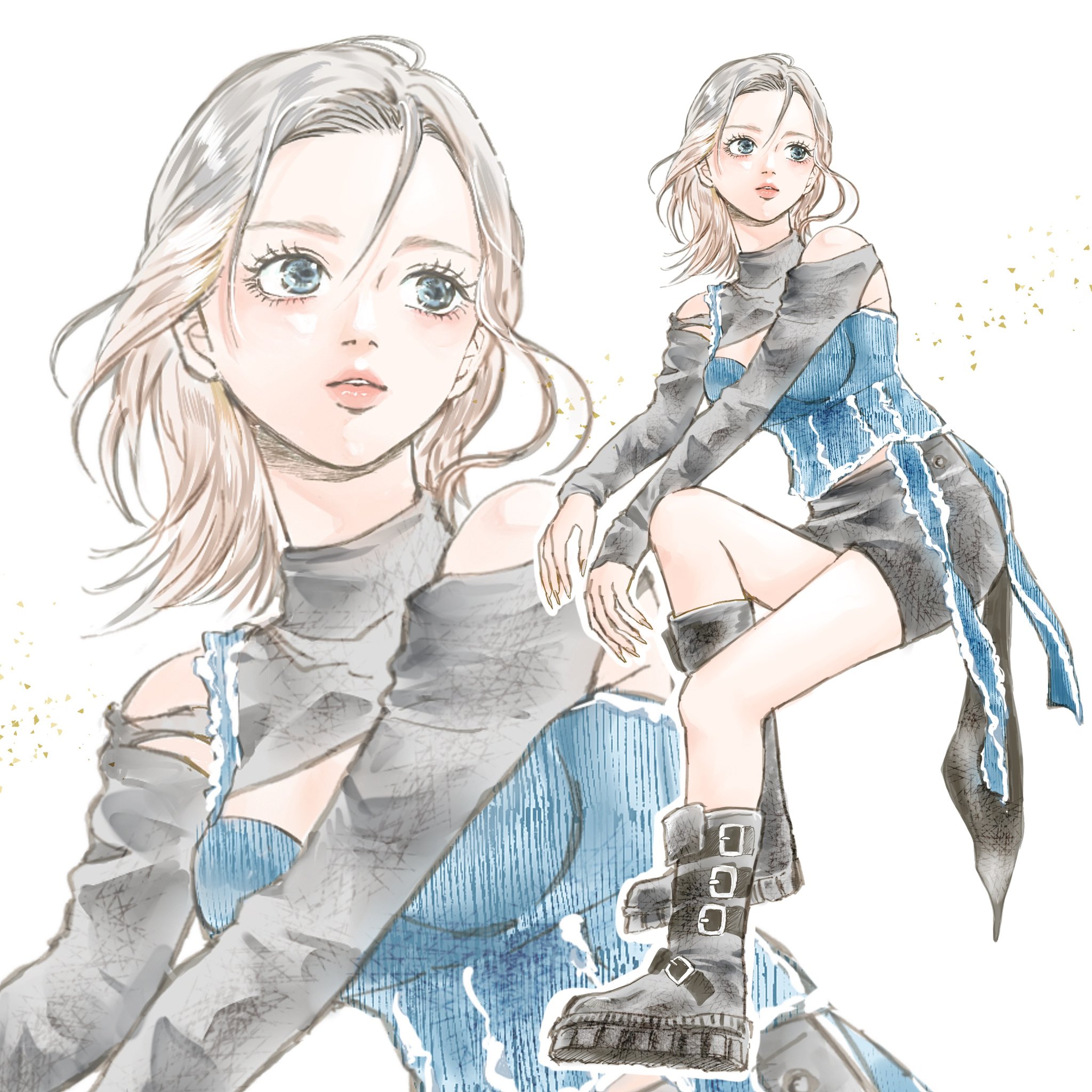 1girl animification black_boots black_shorts black_shrug blonde_hair blue_eyes blue_shirt blush boots clothing_cutout floating_hair head_tilt highres looking_to_the_side looking_up niziu parted_lips real_life riku_(niziu) riyu_(gorinizi_7) shirt short_hair shorts shoulder_cutout shrug_(clothing) sitting solo white_background zoom_layer