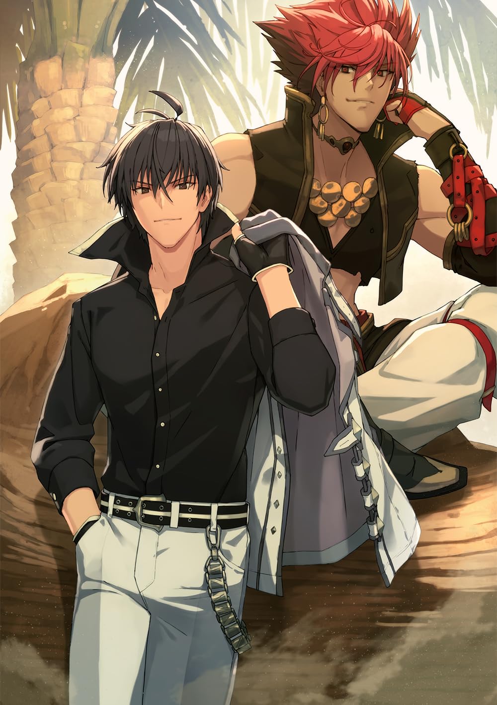 2boys amura_(maou_gakuin) anos_voldigoad belt black_gloves black_hair black_shirt choker collared_shirt crossed_legs earrings fingerless_gloves gloves hand_in_pocket highres jacket jewelry long_sleeves maou_gakuin_no_futekigousha multiple_boys official_art pants red_eyes red_gloves red_hair shirt shizuma_yoshinori sitting standing tagme tree white_jacket white_pants