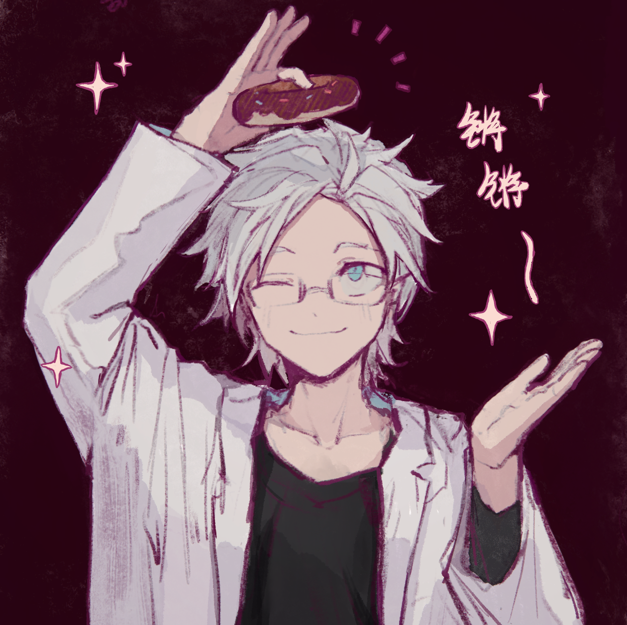 1boy ;3 arm_up black_shirt blue_eyes chinese_commentary chinese_text closed_mouth collarbone colored_lineart commentary_request donut food glasses grey_hair hand_up highres holding holding_food jacket kanou_aogu long_sleeves male_focus one_eye_closed open_clothes open_jacket rectangular_eyewear red_background saibou_shinkyoku shirt short_hair smile solo sparkle translation_request upper_body white_jacket yikousuuu