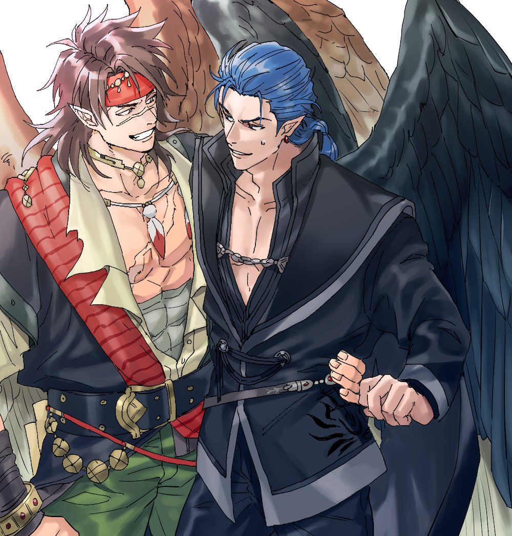 2boys 5_(femfamme) arm_around_another's_waist bare_pectorals belt blue_hair brown_hair commentary_request earrings feather_necklace fire_emblem fire_emblem:_radiant_dawn fire_emblem_heroes headband jewelry laguz_(fire_emblem) long_hair male_focus multiple_boys naesala_(fire_emblem) necklace nintendo official_alternate_costume pectorals pointy_ears ponytail scar scar_on_chest scar_on_face simple_background smile tibarn_(fire_emblem) tibarn_(pirate)_(fire_emblem) white_background wings