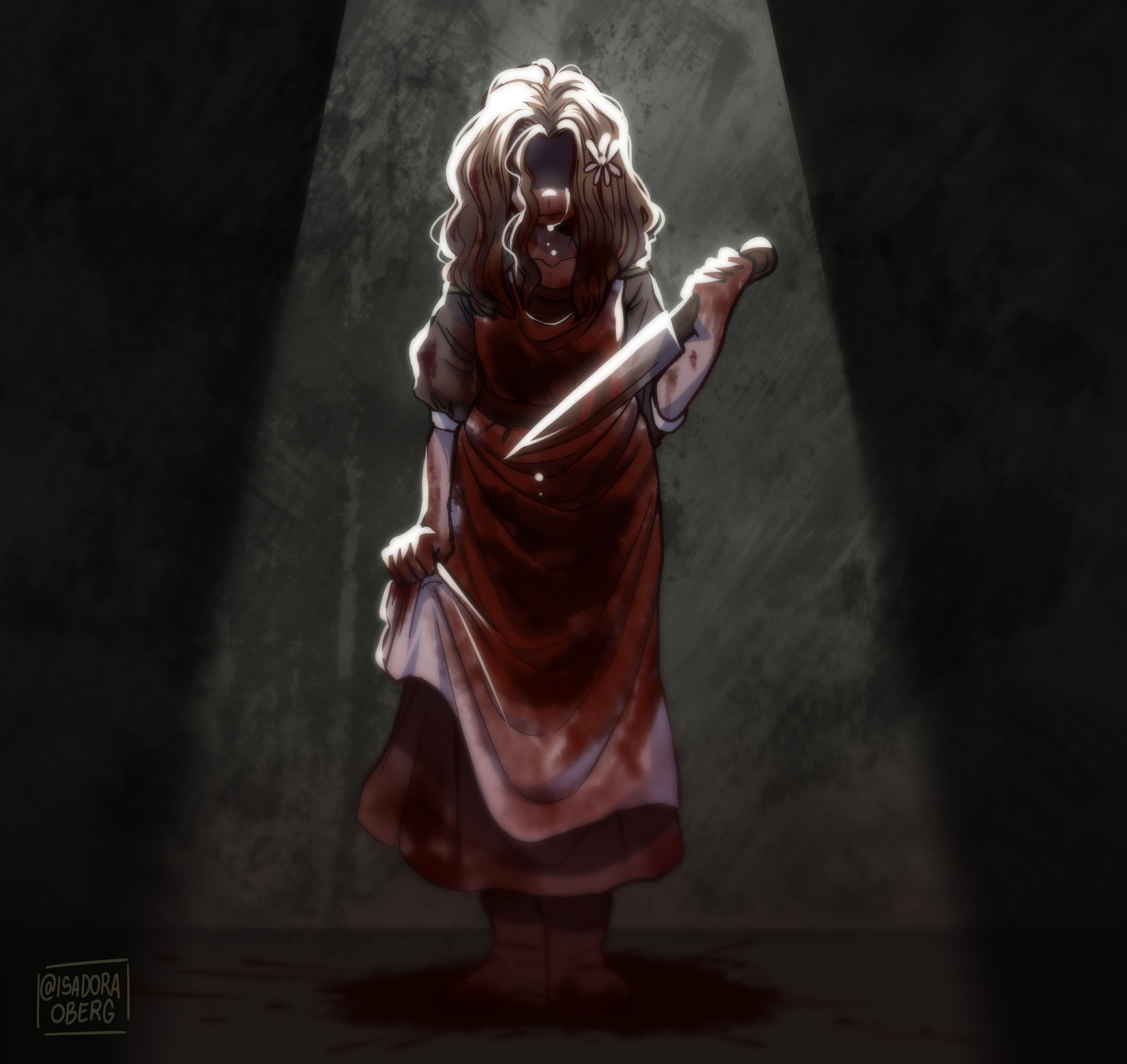 absurdres barbara_lima blood blood_on_clothes blood_on_face blood_splatter covered_face crying dress flower hair_flower hair_ornament highres holding holding_knife isadoraoberg knife long_dress long_hair ordem_paranormal:_o_segredo_na_ilha spotlight wavy_hair