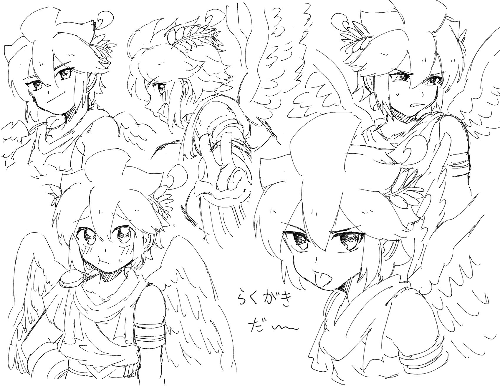:p :t ahoge androgynous armlet clone dark_pit multiple_expressions from_side greyscale highres jewelry kid_icarus kid_icarus_uprising laurel_crown light_blush monochrome nintendo pit_(kid_icarus) scarf shoge sidelocks single_bare_shoulder sketch small_sweatdrop spiked_hair tongue tongue_out translation_request v v-shaped_eyebrows waffuum wings
