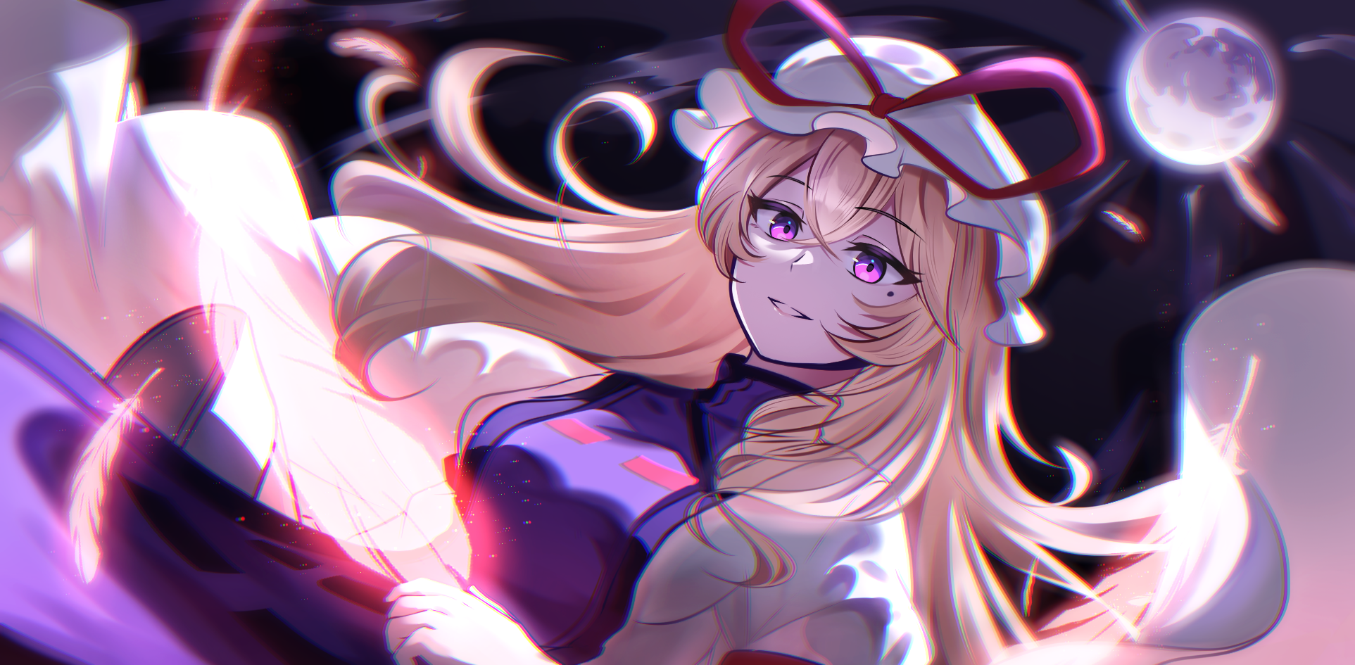1girl blonde_hair breasts commentary_request dress feathers hat hat_ribbon highres long_hair looking_at_viewer mob_cap moon open_mouth purple_eyes purple_tabard red_ribbon ribbon rinkaito1231 solo tabard touhou white_dress white_hat yakumo_yukari