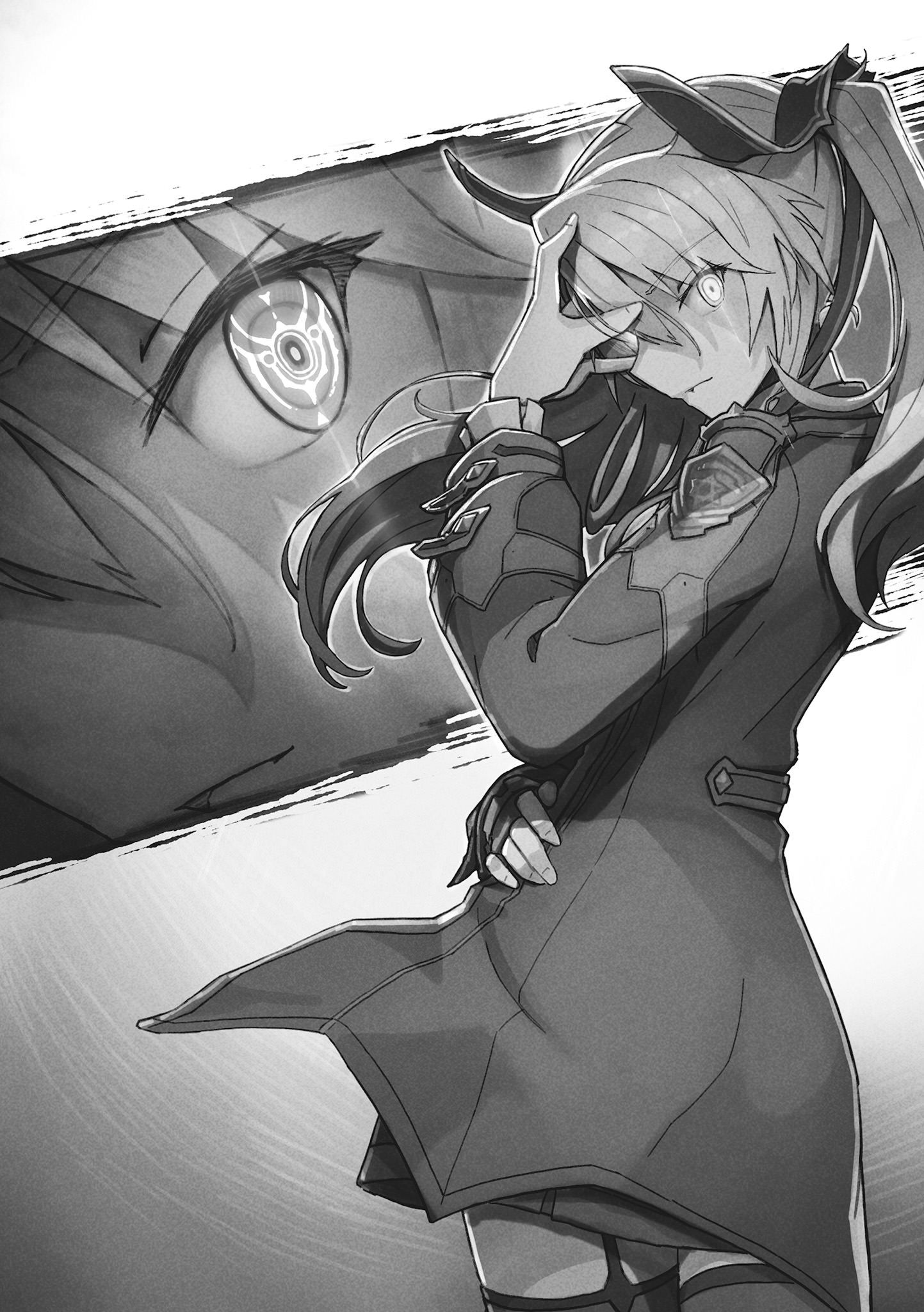 1girl garter_straps glowing glowing_eye hair_ornament hand_on_own_face hand_on_own_hip highres long_hair long_sleeves looking_at_viewer maou_gakuin_no_futekigousha monochrome official_art sasha_necron school_uniform shizuma_yoshinori thighhighs zettai_ryouiki