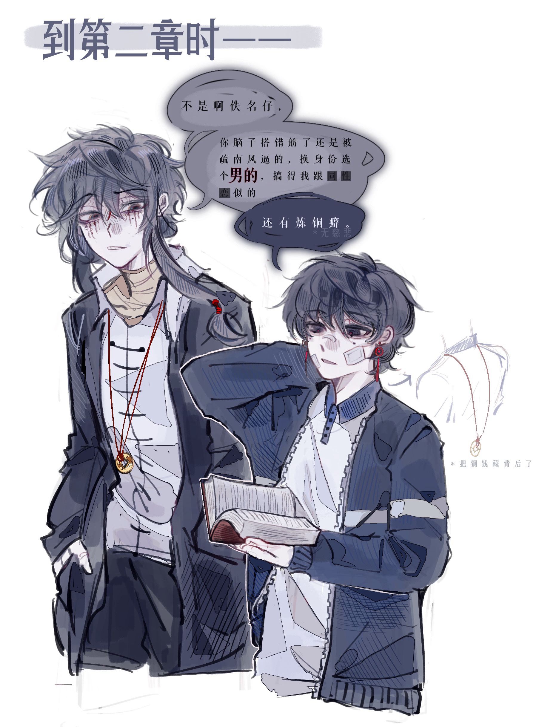 2boys absurdres arm_behind_head bandage_on_face bandages black_eyes black_hair black_jacket black_pants blue_jacket chinese_commentary chinese_text coin coin_on_string collared_shirt commentary_request cropped_legs cropped_torso earrings facepaint hand_in_pocket height_difference highres holed_coin jacket jewelry li_yuting_(male) long_sleeves male_focus multiple_boys open_clothes open_jacket pants shirt short_hair short_hair_with_long_locks simple_background speech_bubble touqi_guaitan translation_request white_background white_shirt zhenyi51927 ziche_fuzhao