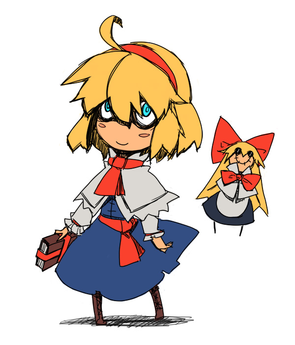 1girl ahoge alice_margatroid blonde_hair blue_dress blue_eyes blush_stickers book boots bow bowtie brown_boots button_eyes buttons capelet chibi chibi_only commentary_request dress floating floating_object full_body grimoire_of_alice hair_bow hairband holding holding_book knee_boots long_hair long_sleeves medium_hair red_bow red_bowtie red_hairband red_ribbon ribbon shaded_face shanghai_doll shirt smile solo totteri touhou white_background white_capelet white_shirt