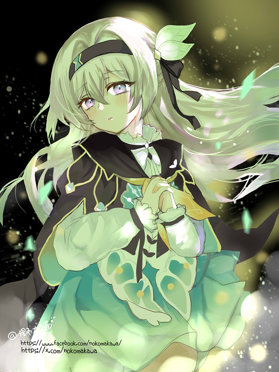 1girl black_hairband blue_eyes blue_skirt blush commentary_request firefly_(honkai:_star_rail) floating_hair hair_between_eyes hair_intakes hairband highres honkai:_star_rail honkai_(series) interlocked_fingers long_hair looking_at_viewer lunacats own_hands_clasped own_hands_together parted_lips shirt skirt solo twitter_username very_long_hair watermark web_address white_hair white_shirt