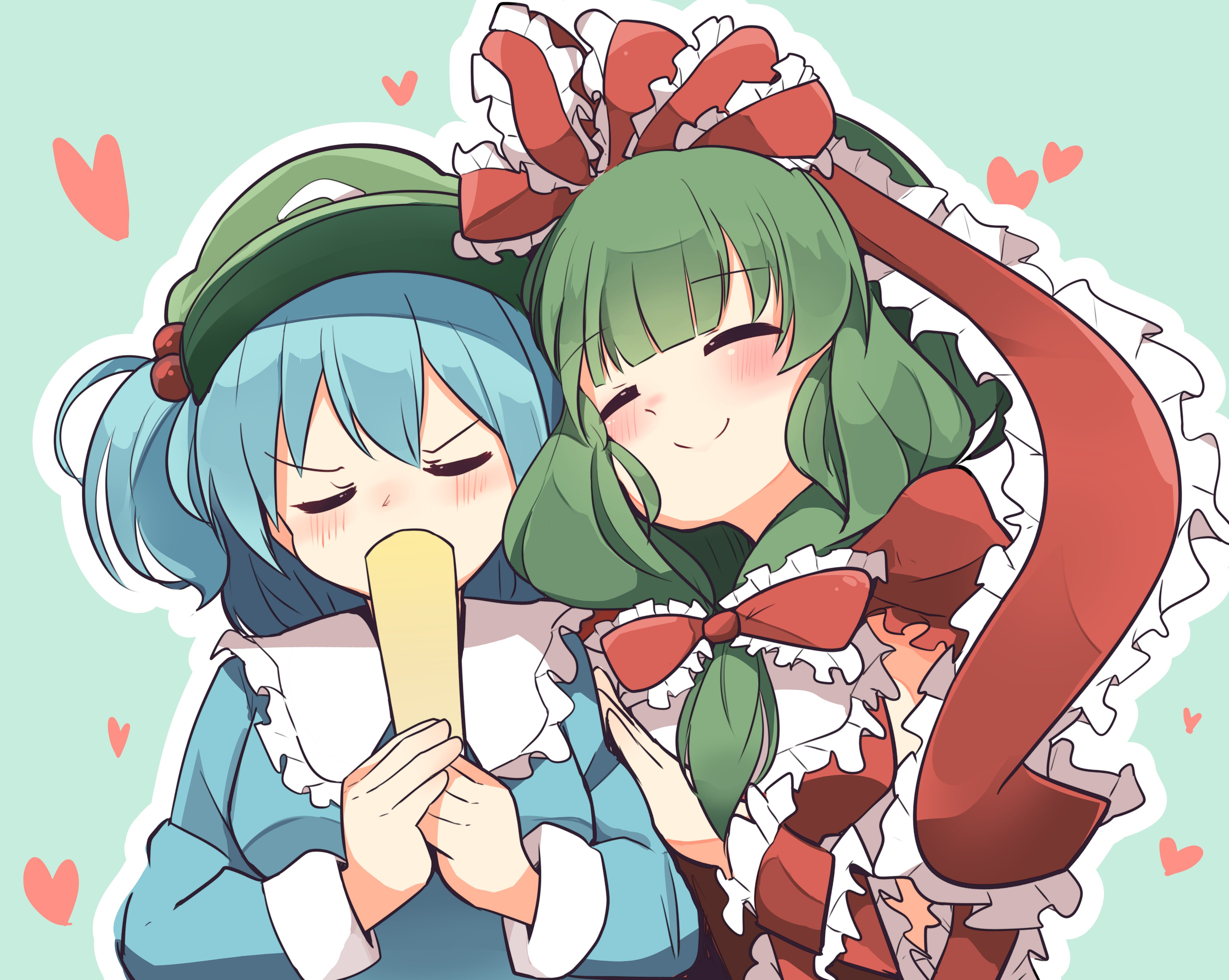 2girls absurdres arm_ribbon blue_background blue_hair bow front_ponytail green_hair hair_bow hair_ribbon heart highres kagiyama_hina kawashiro_nitori multiple_girls pachio_(patioglass) ribbon shy smile tagme touhou two_side_up upper_body yuri