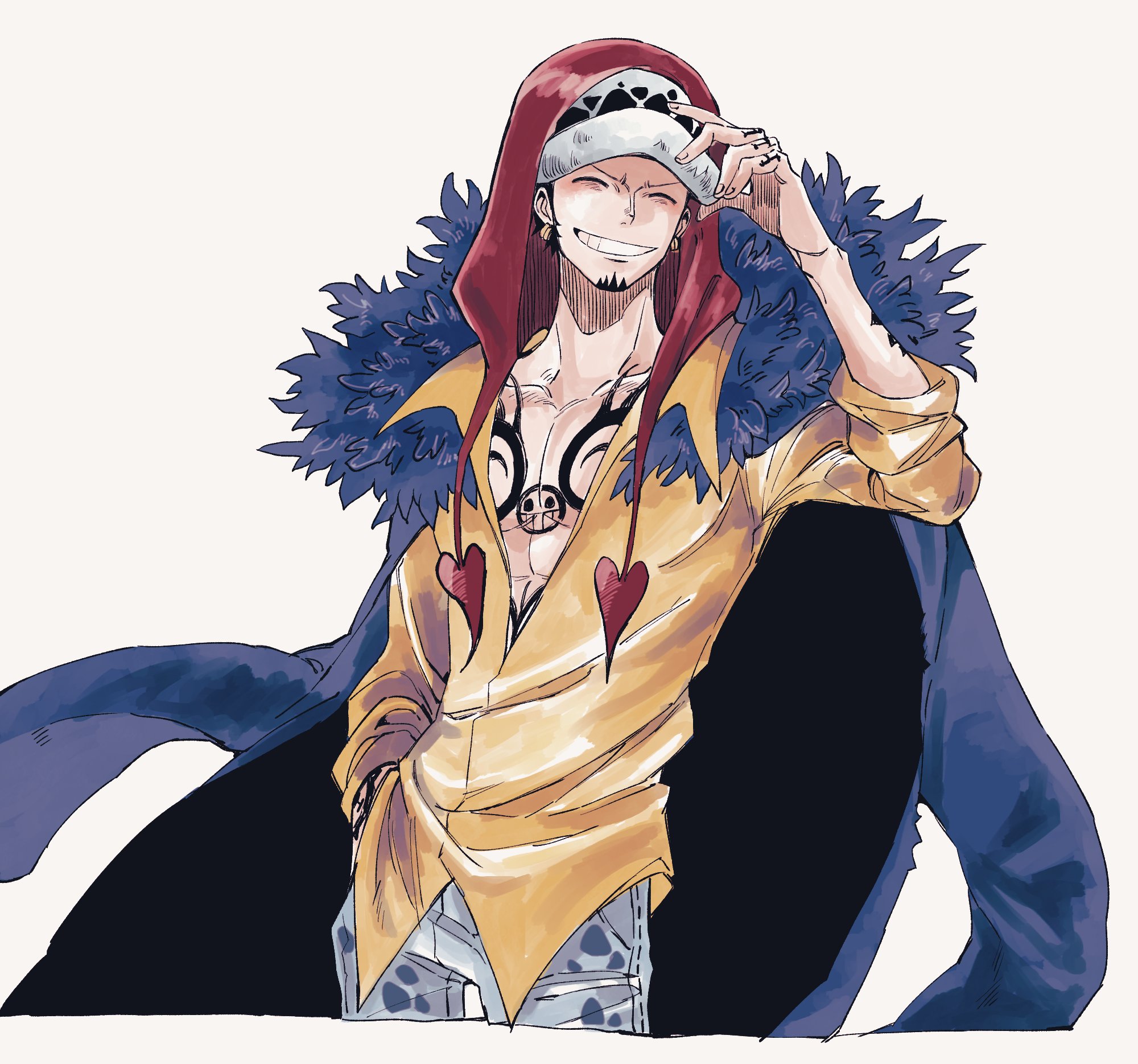 1boy ^_^ black_hair blue_coat chest_tattoo closed_eyes coat coat_on_shoulders cosplay denim donquixote_rocinante donquixote_rocinante_(cosplay) earrings facial_hair fur-trimmed_coat fur_trim grin hand_in_pocket hand_on_headwear happy hat highres jeans jewelry living_(nsiring) male_focus one_piece pants partially_unbuttoned red_hood shirt sleeves_rolled_up smile solo tattoo trafalgar_law white_background yellow_shirt