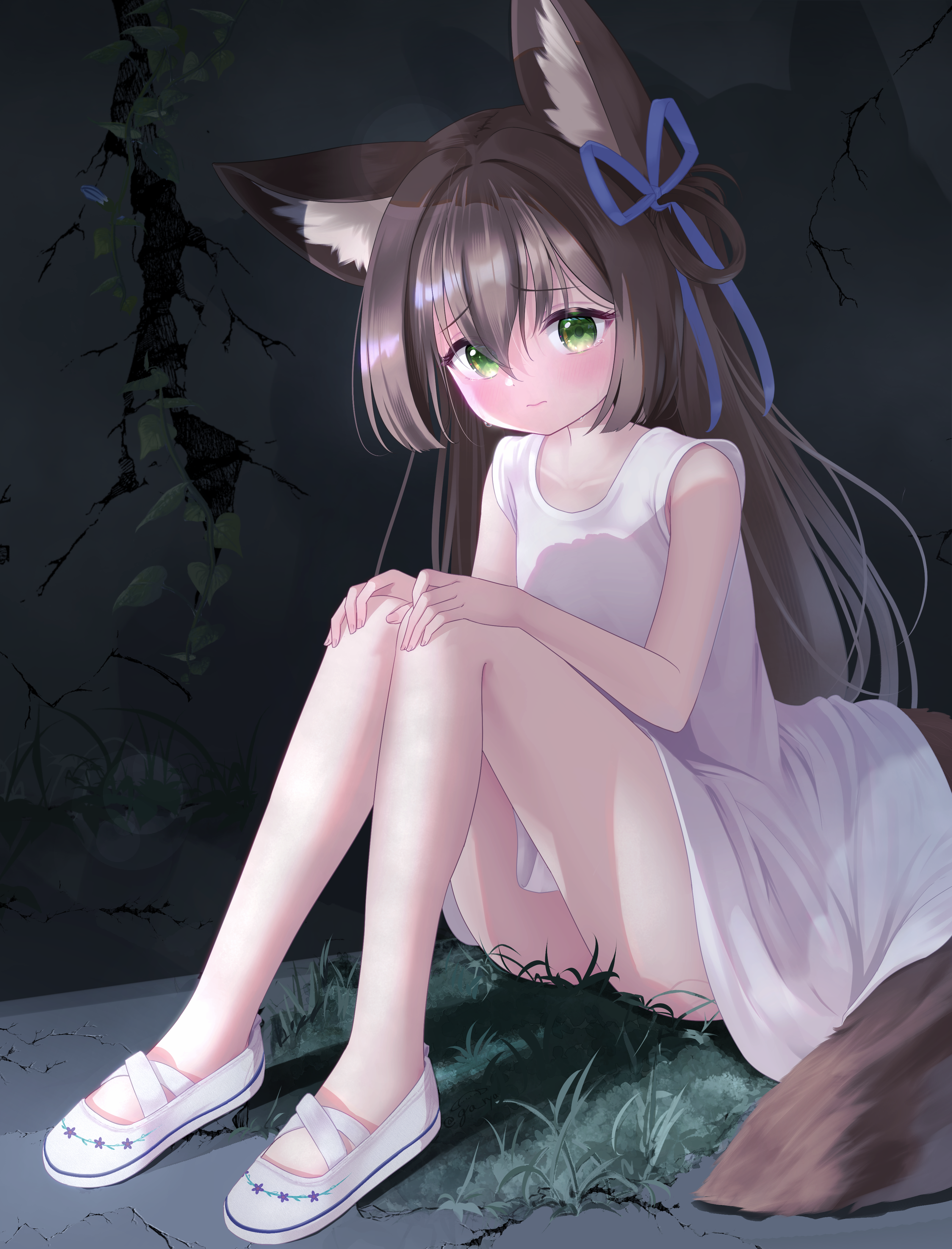1girl absurdres animal_ear_fluff animal_ears bare_legs brown_hair crack cracked_wall dress flat_chest fox_ears fox_girl fox_tail gaarya grass green_eyes hands_on_own_knees highres knees_up legs long_hair looking_at_viewer on_ground original short_dress sitting sleeveless sleeveless_dress tail tearing_up tears white_dress
