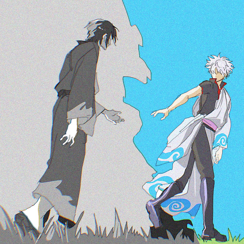 2boys black_footwear black_pants black_shirt blue_sky boots faceless faceless_male full_body gintama grass japanese_clothes kimono looking_at_another looking_back male_focus multiple_boys pants partially_colored reaching sakata_gintoki shirt short_hair short_sleeves sky split_theme susu_gntm takasugi_shinsuke walking white_hair