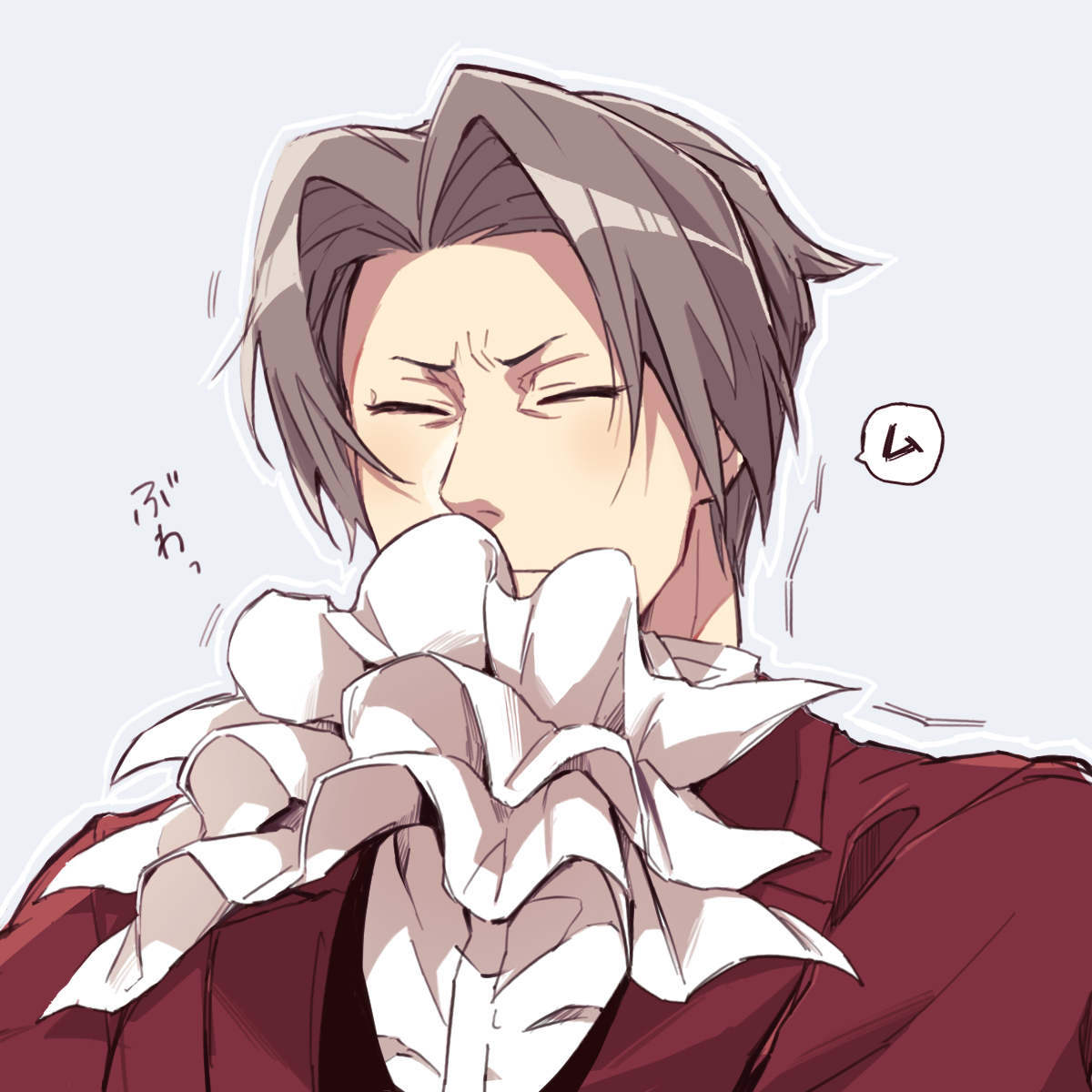 1boy ace_attorney ascot closed_eyes closed_mouth formal_clothes grey_hair grimace highres male_focus miles_edgeworth parted_bangs red_suit shirt short_hair simple_background solo sound_effects speech_bubble suit surprised vest white_ascot white_background white_shirt wind wind_lift yyyo_m7