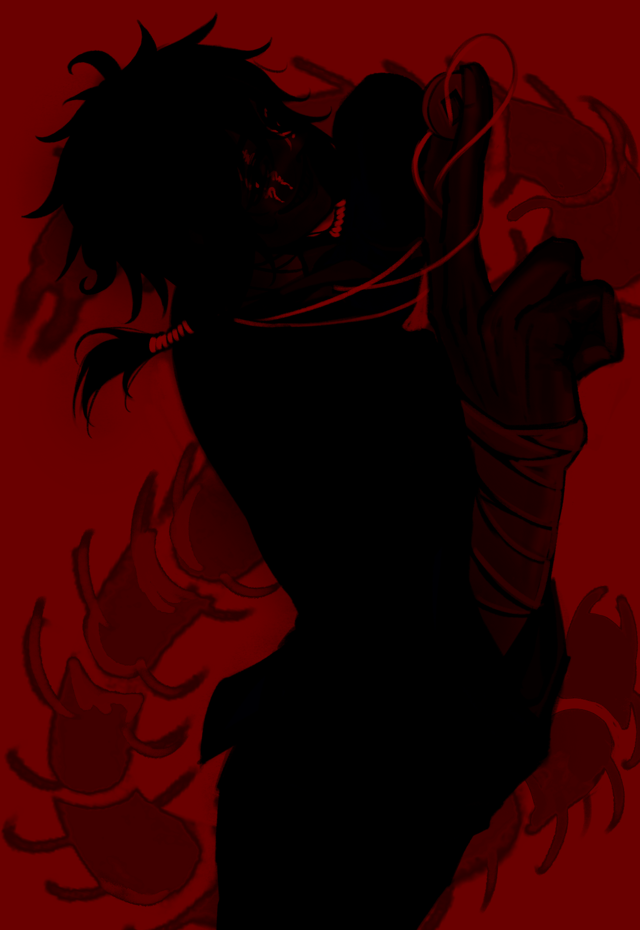 1boy apple_(qingcha059) bandaged_arm bandages bug centipede chinese_commentary coin coin_on_string commentary_request cowboy_shot greyscale_with_colored_background highres holding holding_coin holed_coin male_focus red_background silhouette solo spot_color touqi_guaitan variant_set ziche_fuzhao