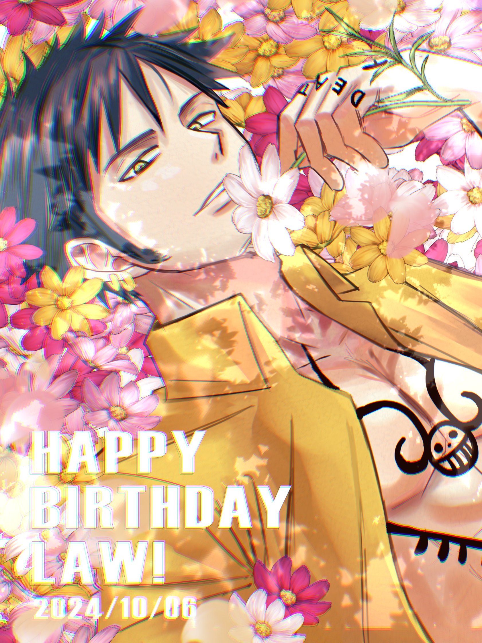 1boy black_hair character_name chest_tattoo commentary_request daisy_(flower) dated flower hand_tattoo happy_birthday highres holding holding_flower looking_at_viewer lying male_focus on_back one_piece shirt short_hair sideburns smile solo spiked_hair tattoo trafalgar_law yellow_eyes yellow_shirt zwtpms