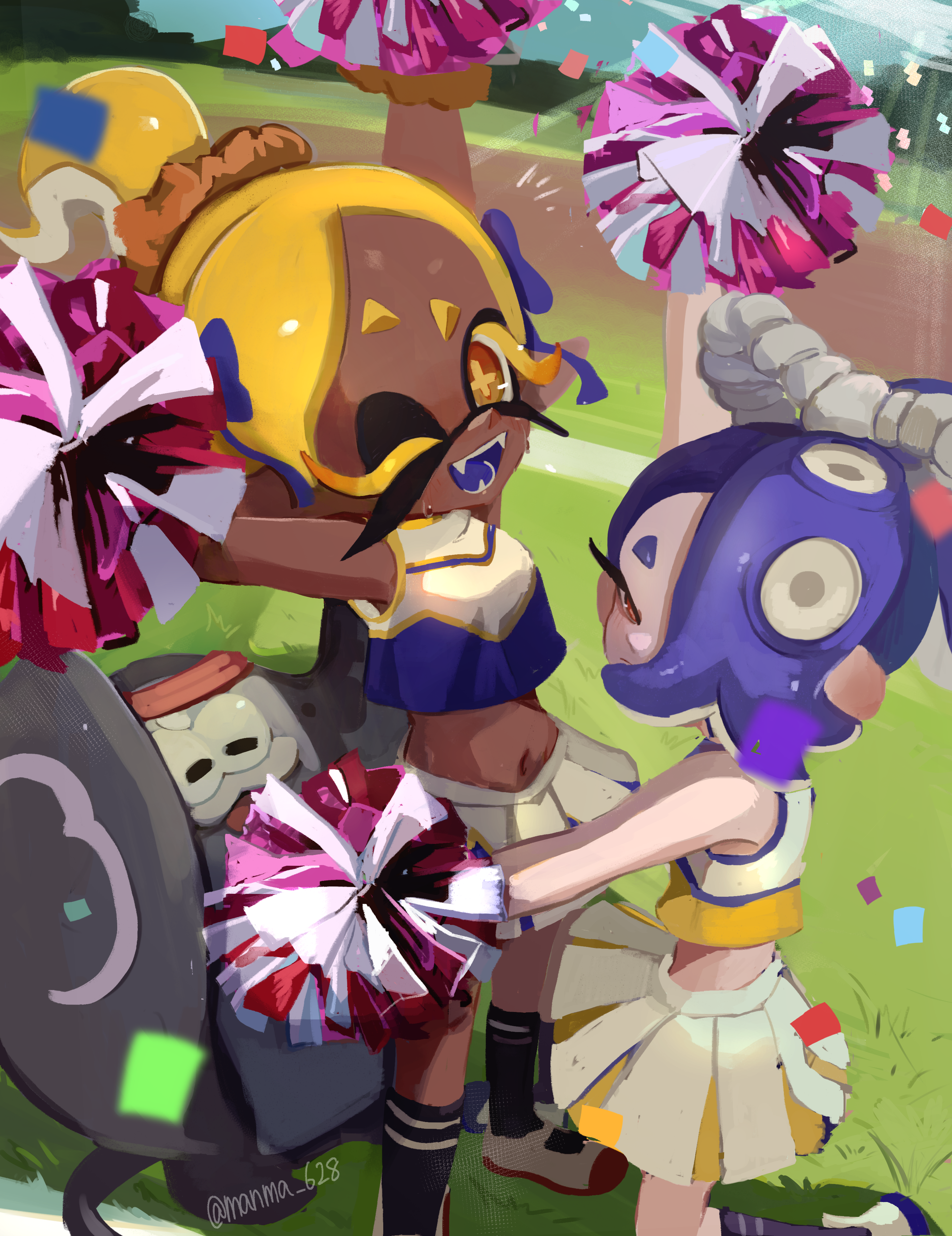 1boy 2girls absurdres alternate_costume alternate_hairstyle arms_up big_man_(splatoon) blonde_hair blue_hair cheerleader dark-skinned_female dark_skin fangs from_above frye_(splatoon) full_body grass headband highres inkling kneeling looking_at_viewer manma_628 manta_ray multiple_girls navel nintendo octoling open_mouth outdoors pleated_skirt pointy_ears pom_pom_(cheerleading) ponytail red_eyes shiver_(splatoon) skirt smile socks splatoon_(series) splatoon_3 standing sweat tentacle_hair yellow_eyes