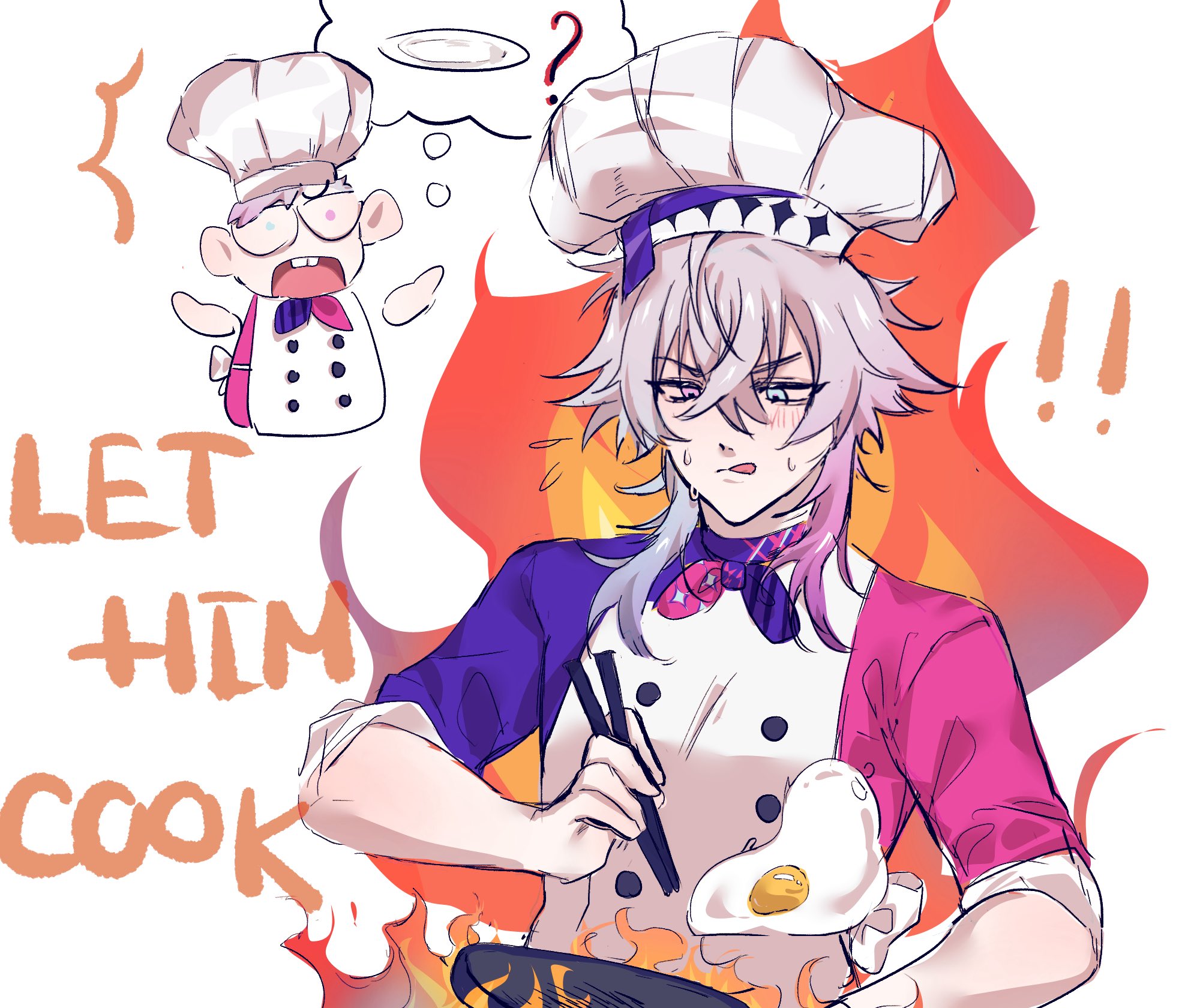 ! !! bettel_2_(gavis_bettel) bishounen blue_eyes blue_hair brothers chef chef_hat chopsticks cooking empty_plate english_text fire fried_egg frying_pan gavis_bettel glasses grey_hair hair_between_eyes hashtag-only_commentary hat heterochromia highres holding holding_chopsticks holostars holostars_english kagemeomeo male_focus medium_hair multicolored_hair multiple_boys open_mouth pink_eyes pink_hair short_hair siblings simple_background sketch speech_bubble sweat thought_bubble tongue tongue_out twins upper_body virtual_youtuber