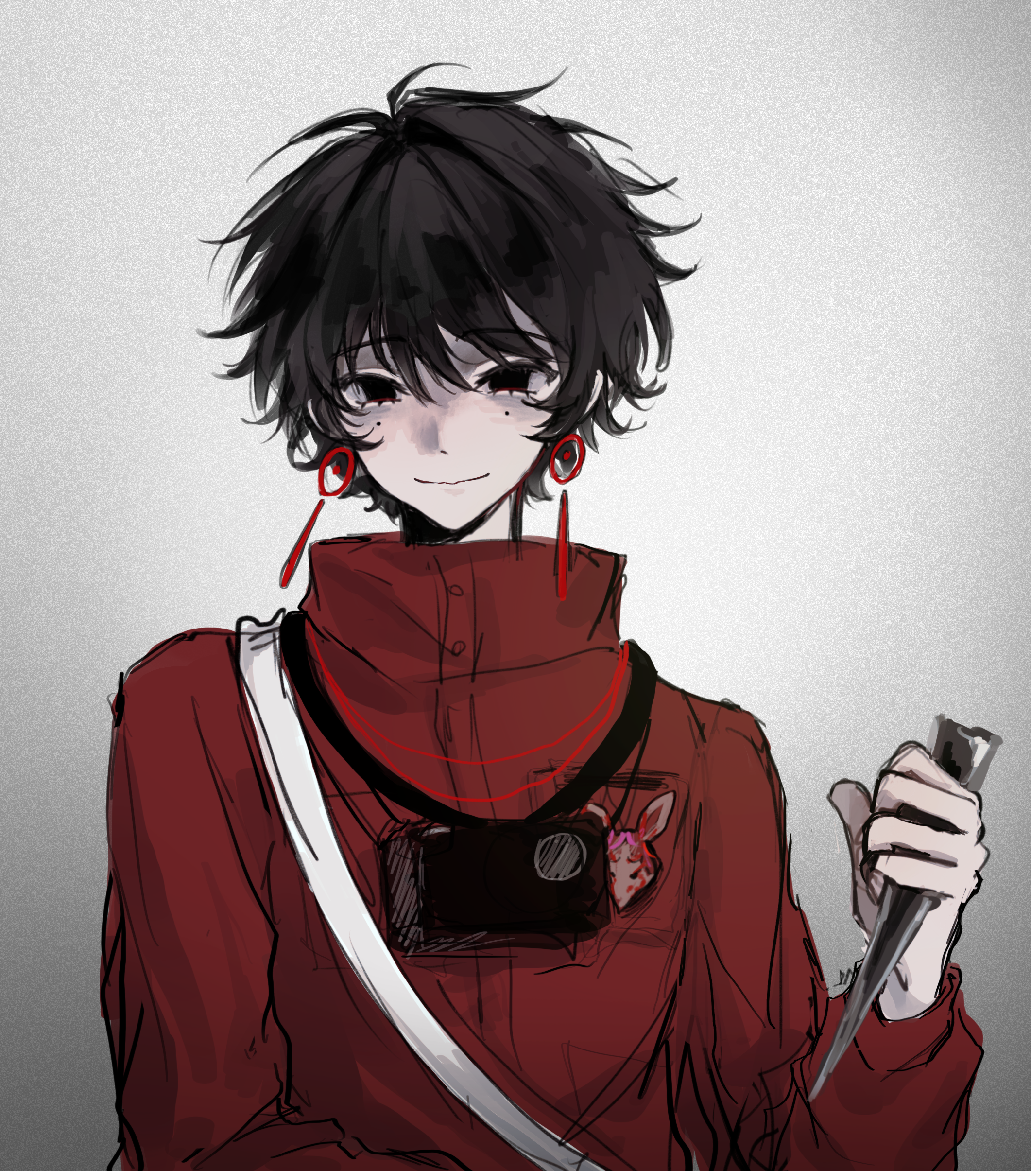 1boy absurdres anian black_eyes black_hair camera camera_around_neck chinese_commentary closed_mouth commentary_request earrings grey_background hair_between_eyes high_collar highres holding holding_weapon jewelry li_yuting_(male) long_sleeves looking_at_viewer male_focus mole mole_under_each_eye mole_under_eye multiple_moles short_hair smile solo touqi_guaitan upper_body variant_set weapon