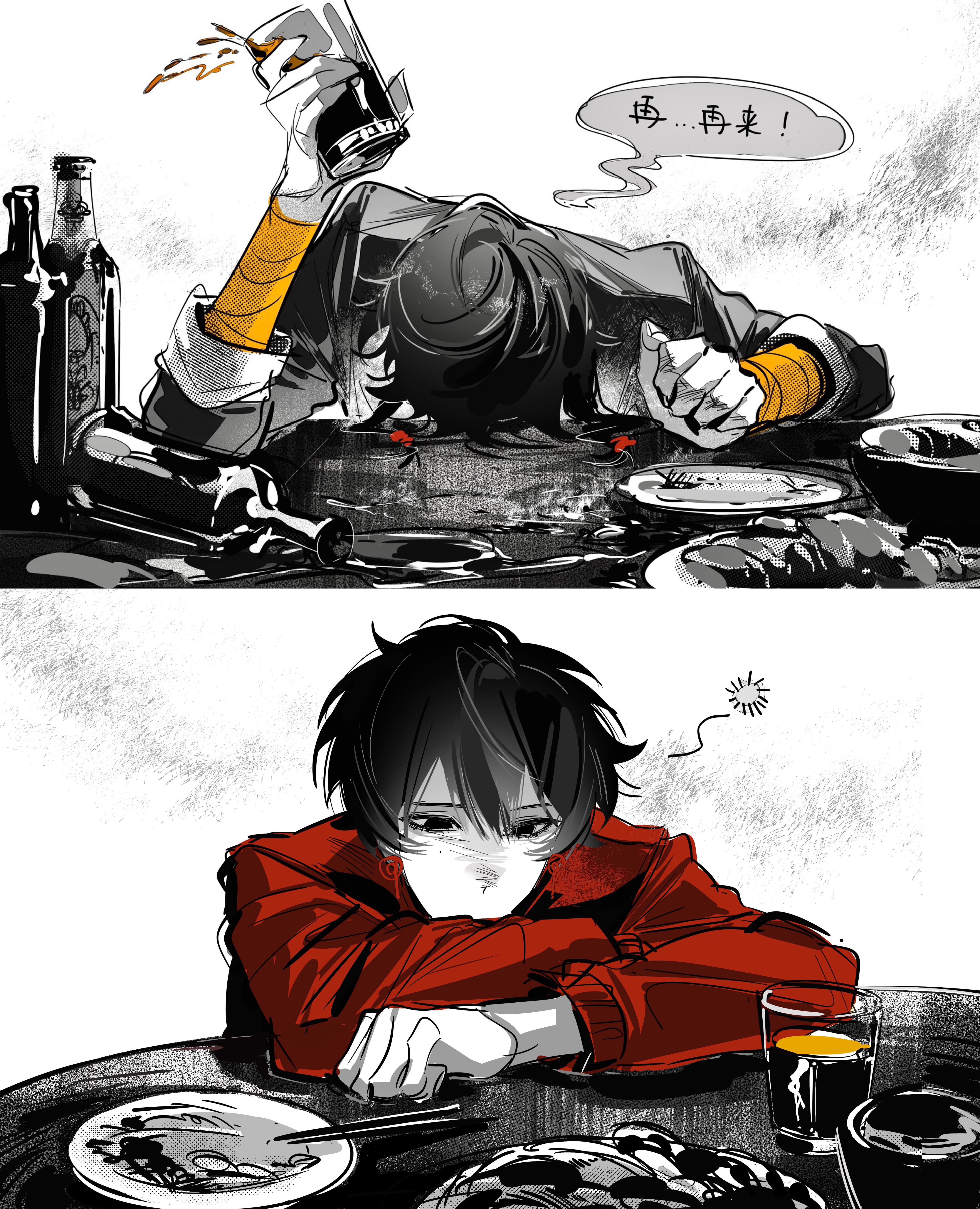 2boys absurdres arm_up bandaged_arm bandages bottle chinese_commentary commentary_request cup drunk earrings elbows_on_table face_down glugluglucose greyscale hair_between_eyes highres holding holding_cup jewelry li_yuting_(male) long_sleeves male_focus mole mole_under_each_eye mole_under_eye monochrome multiple_boys multiple_moles plate red_shirt shirt short_hair speech_bubble spot_color squeans touqi_guaitan ziche_fuzhao