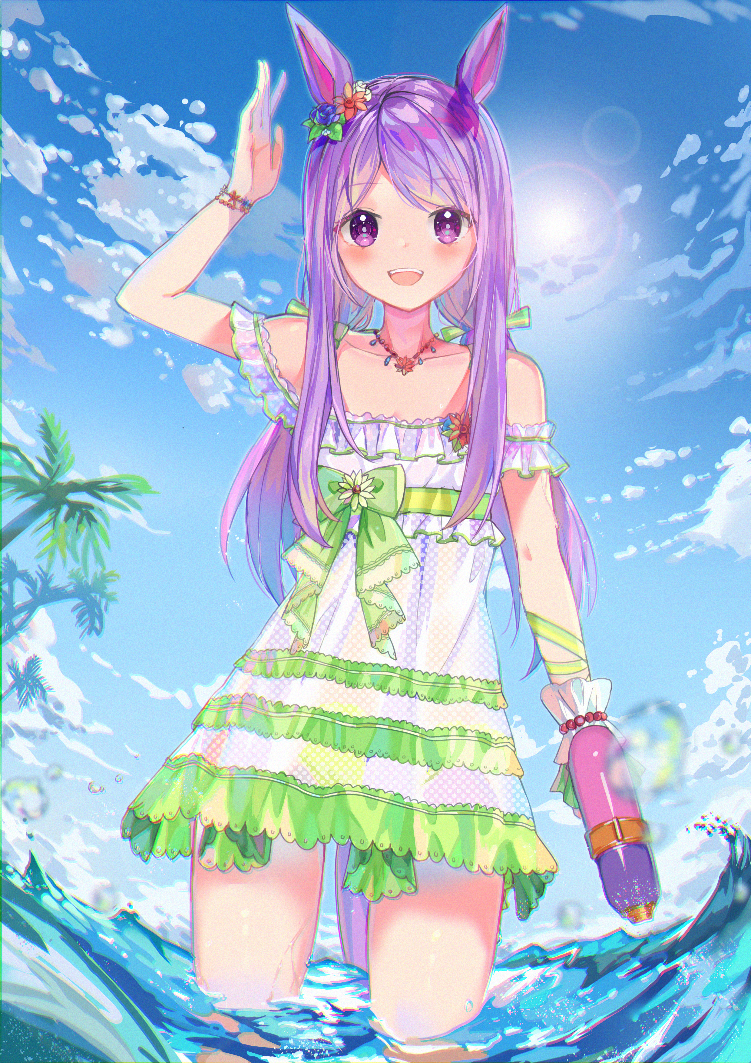 1girl absurdres animal_ears blue_sky bracelet chinese_commentary cloud cloudy_sky commentary_request cowboy_shot day dress dress_swimsuit ear_ornament green_dress green_ribbon hair_ribbon highres hiroshi_(xswl_1919007) holding holding_water_gun horse_ears horse_girl horse_tail jewelry long_hair looking_at_viewer low_twintails mejiro_mcqueen_(ripple_fairlady)_(umamusume) mejiro_mcqueen_(umamusume) necklace ocean off-shoulder_dress off_shoulder official_alternate_costume open_mouth outdoors palm_tree purple_eyes purple_hair ribbon short_dress sky smile solo standing tail tree twintails two-tone_dress umamusume wading water water_gun white_dress