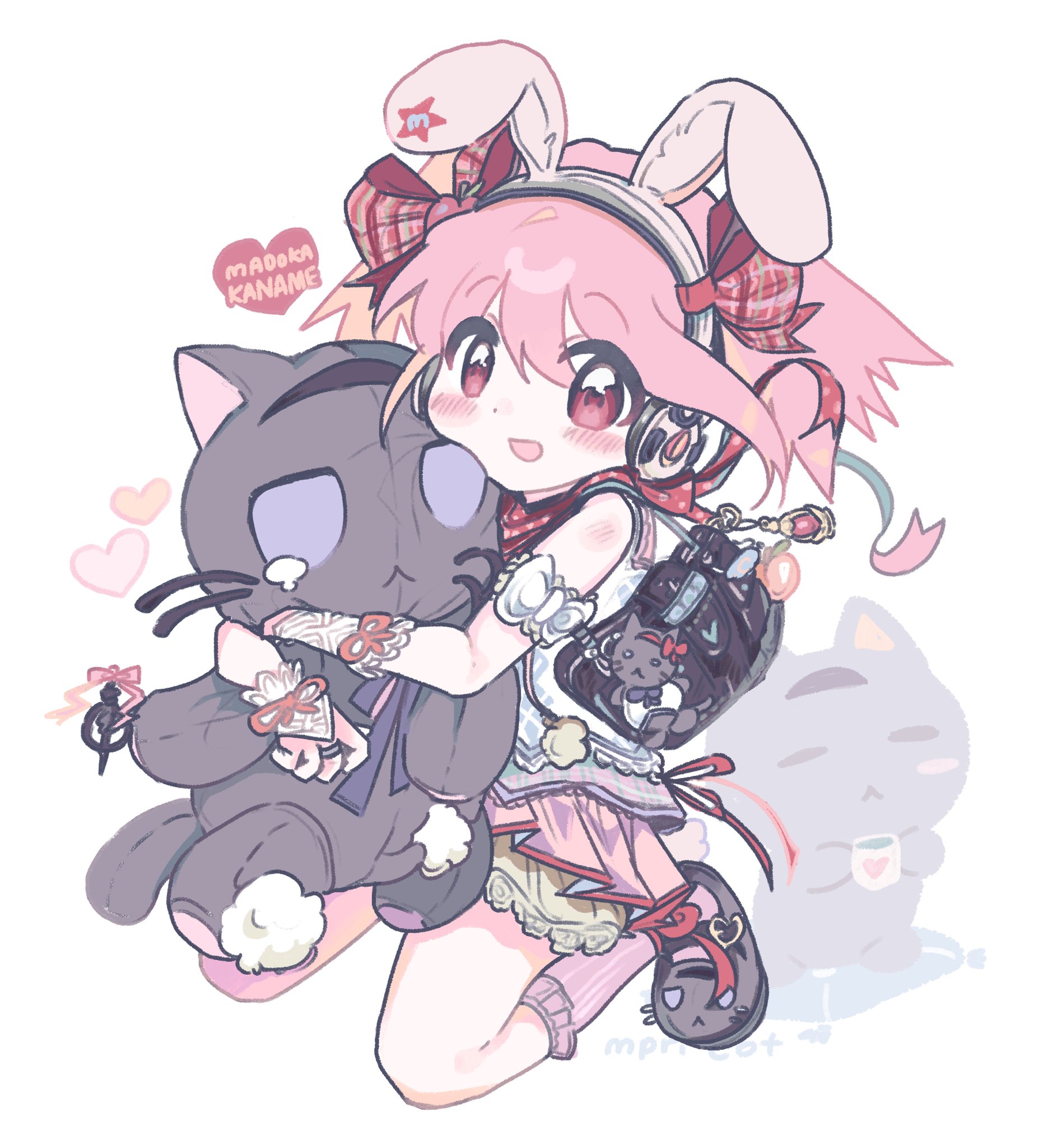 1girl akemi_homura alternate_costume animal-themed_footwear animal_ear_headphones animal_ears arm_bow artist_name bag belt_buckle black_background black_bag black_shoes bloomers blush bow bowtie bridal_gauntlets buckle buttons character_name dot_nose fake_animal_ears fashion floppy_ears frilled_socks frills full_body grief_seed hair_bow headphones heart heart_button heart_print highres holding holding_stuffed_toy kaname_madoka kerimka31328031 kneehighs looking_at_viewer mahou_shoujo_madoka_magica mahou_shoujo_madoka_magica_(anime) mary_janes microskirt open_mouth pink_eyes pink_hair pink_skirt pink_socks plaid_bow pleated_skirt polka_dot polka_dot_scarf purple_bow purple_bowtie rabbit_ears red_bow red_ribbon red_scarf ribbon scarf school_bag shirt shoes short_hair short_twintails simple_background skirt sleeveless sleeveless_shirt smile socks solo star_(symbol) star_sticker sticker sticker_on_ear striped_clothes striped_socks stuffed_animal stuffed_cat stuffed_toy stuffing twintails underwear vertical-striped_clothes vertical-striped_socks white_background white_bloomers white_bow white_bridal_gauntlets white_shirt wrist_ribbon
