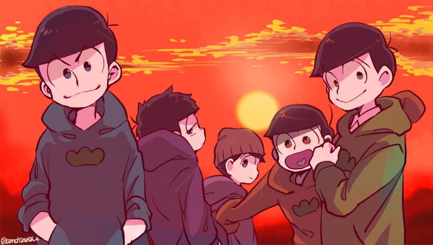 5boys :3 ahoge antenna_hair banchi_(bantyanizumu) beanie blue_eyes blue_hoodie blunt_bangs brothers brown_hair closed_mouth cloud cloud_print collared_shirt from_behind green_hoodie hand_on_own_chest hands_in_pockets hat hood hood_down hoodie looking_back male_focus matsuno_choromatsu matsuno_ichimatsu matsuno_jyushimatsu matsuno_karamatsu matsuno_todomatsu messy_hair mountainous_horizon multiple_boys orange_eyes orange_hair orange_skirt osomatsu-san osomatsu_(series) outdoors outstretched_arms purple_eyes purple_hoodie red_hoodie shirt short_hair siblings skirt sleeves_past_fingers sleeves_past_wrists sleeves_rolled_up smile sun sunset twitter_username upper_body v-shaped_eyebrows white_shirt