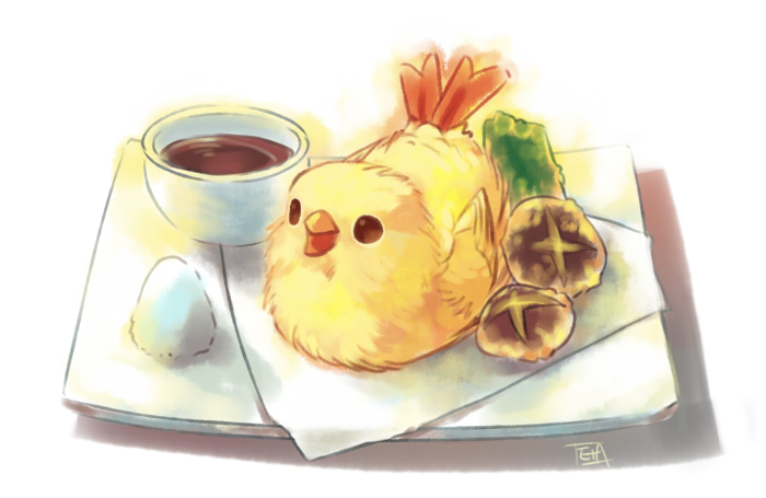 animal animal_focus beak bird bowl era_(traveling_bird) feathers fishball food food_focus look-alike no_humans open_mouth original pun soy_sauce tempura
