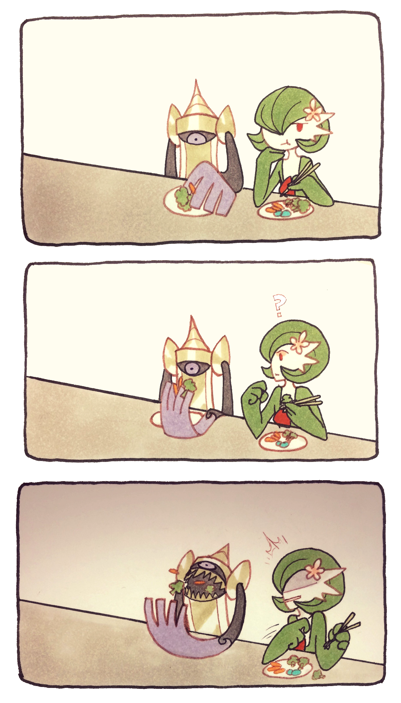 ? aegislash bob_cut chopsticks eating fangs flower food food_in_mouth gardevoir gen_3_pokemon gen_6_pokemon green_hair hair_flower hair_ornament hair_over_one_eye highres holding holding_chopsticks nintendo one-eyed pink_eyes plate pokemon pokemon_(creature) smile xyliaxart