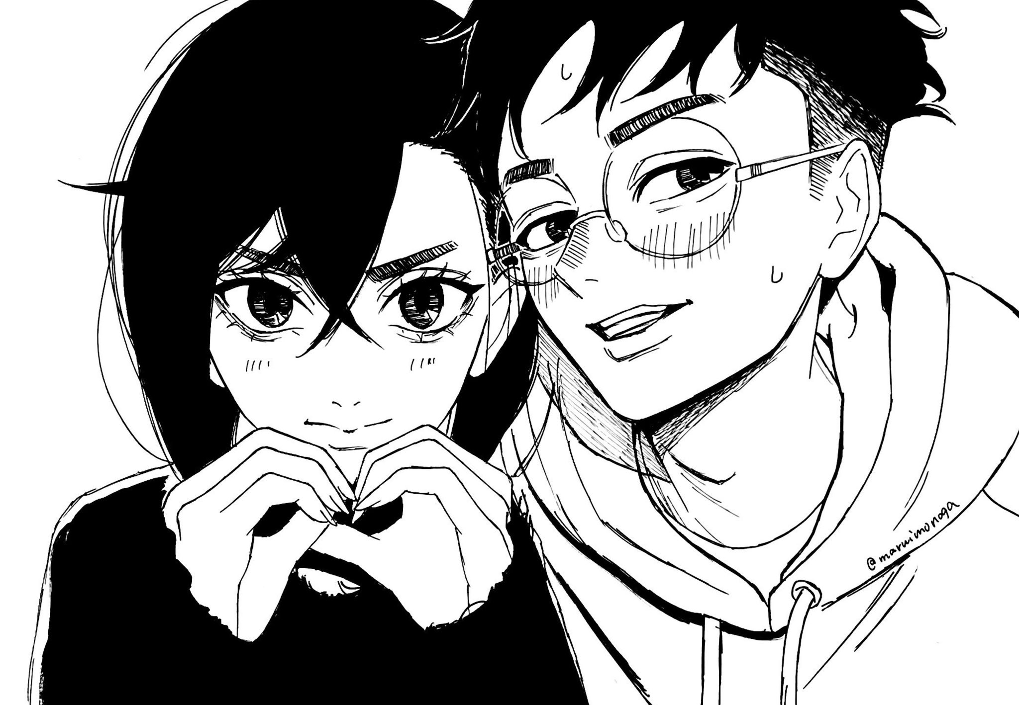 1boy 1girl ayase_momo glasses highres hood hoodie maruimonoga monochrome sketch takakura_ken_(dandadan) watermark
