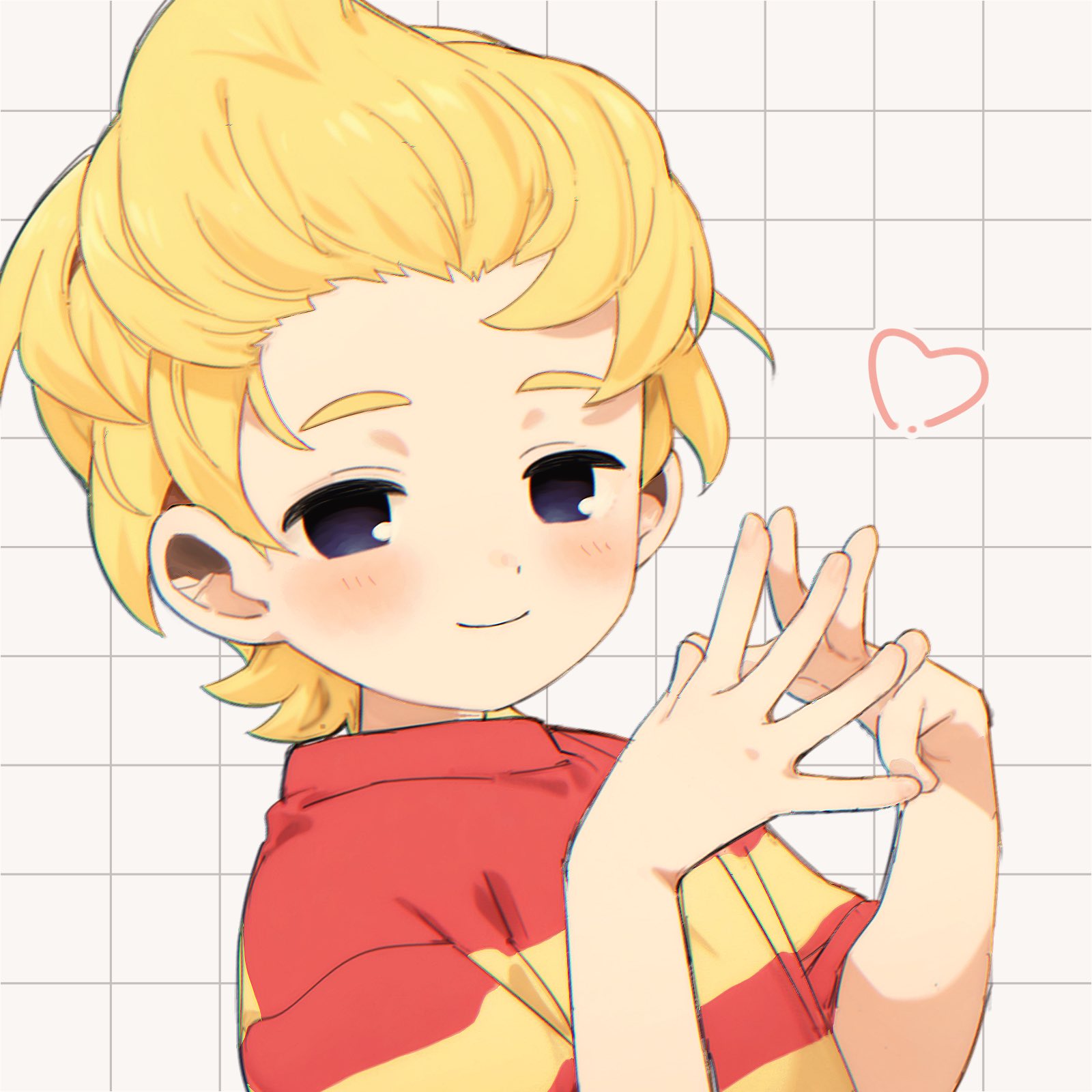 1boy blonde_hair blue_eyes blush closed_mouth commentary heart highres looking_at_viewer lucas_(mother_3) male_focus mother_(series) mother_3 nintendo otoku_41 shirt short_sleeves simple_background solo steepled_fingers striped_clothes striped_shirt upper_body