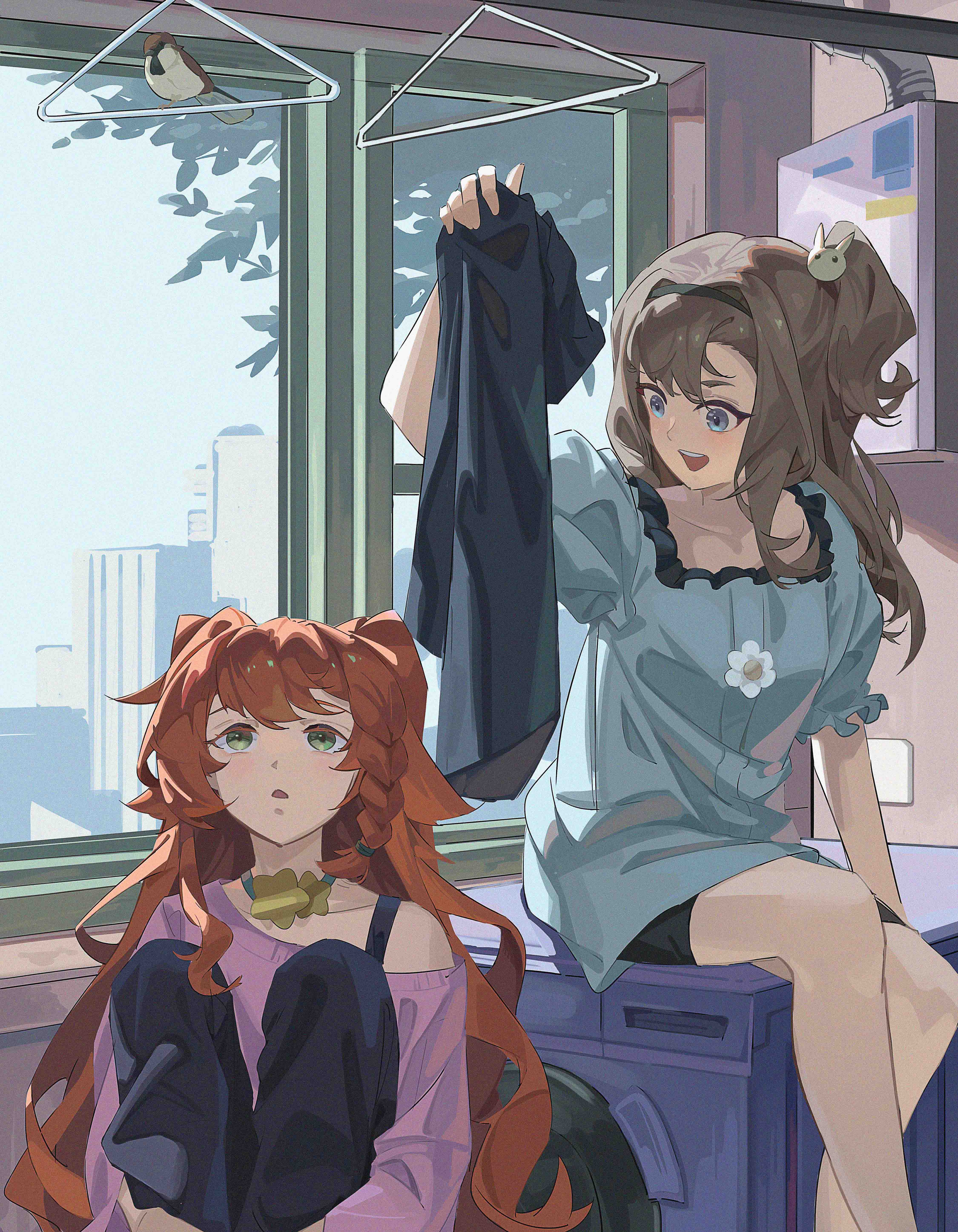 2girls :d absurdres bird black_shorts blue_eyes blue_pants blue_shirt blue_sky building choker clothes_hanger frilled_sleeves frills green_eyes grey_hair hand_up highres holding_cloth hugging_own_legs indoors knees_to_chest long_hair looking_at_animal looking_at_another looking_to_the_side looking_up matilda_bouanich medium_hair multiple_girls one_side_up open_mouth orange_hair pants pink_shirt reverse:1999 shirt short_sleeves shorts single_bare_shoulder single_off_shoulder sitting sky smile sonetto_(reverse:1999) sparrow star_(symbol) star_choker triangle_mouth turning_head two_side_up washing_machine water_heater window zzzzzziyao