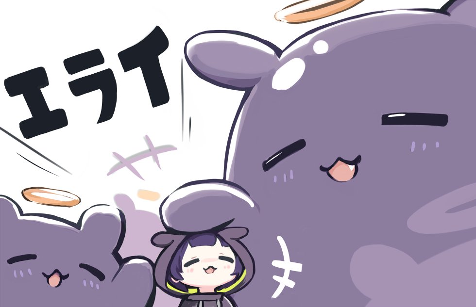 1girl chibi closed_eyes fang halo headpat hololive hololive_english hood hood_up hoodie ninomae_ina'nis ninomae_ina'nis_(loungewear) purple_hair takodachi_(ninomae_ina'nis) virtual_youtuber white_background yuuyu_(777)