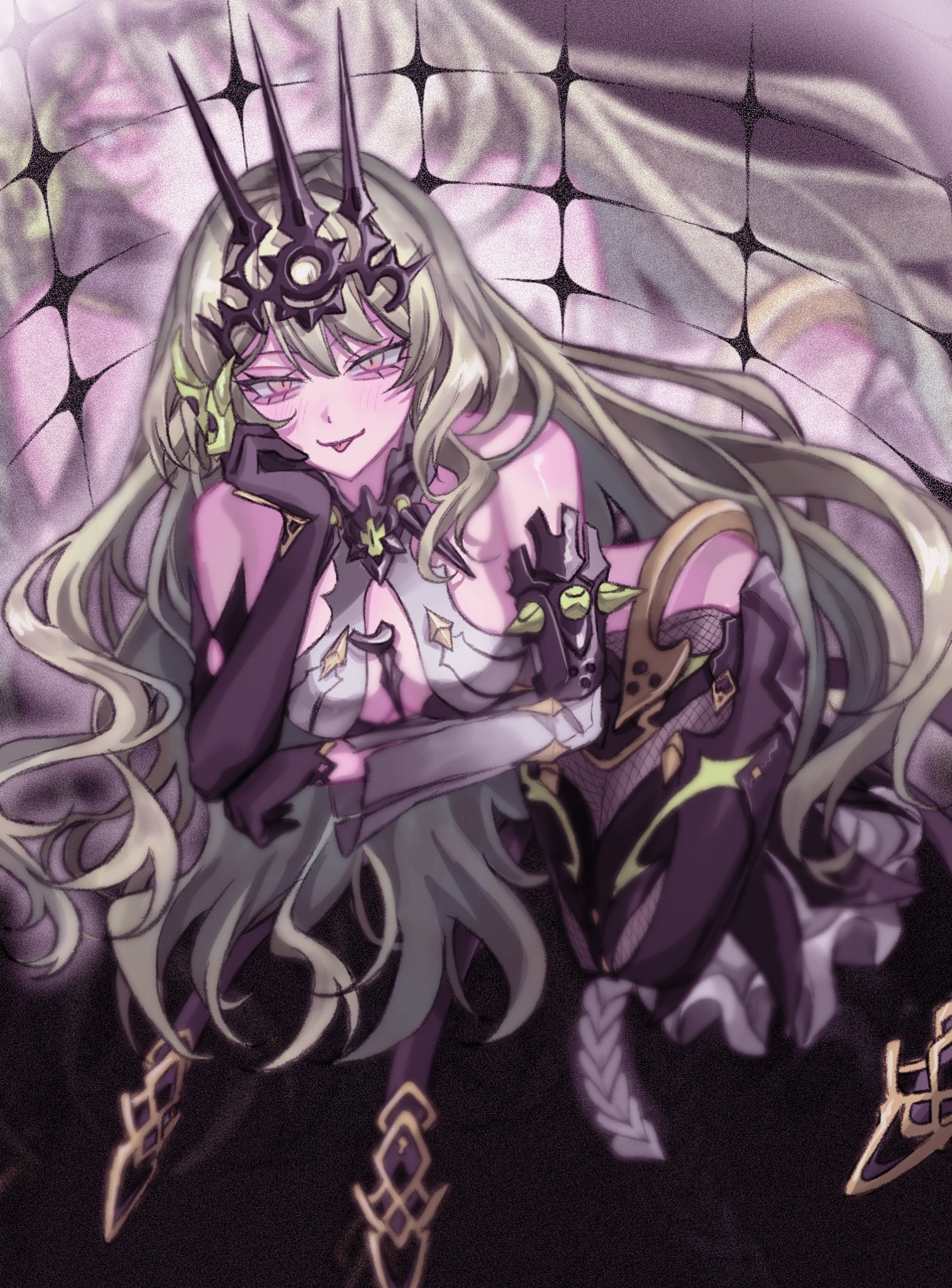 1girl bare_shoulders black_dress black_gloves commentary crown dress gloves green_eyes green_hair halter_dress halterneck head_rest highres honkai_(series) honkai_impact_3rd l0ver_t_t leaning_forward light_blush long_hair mobius_(honkai_impact) slit_pupils solo untranslatable_commentary tongue tongue_out very_long_hair