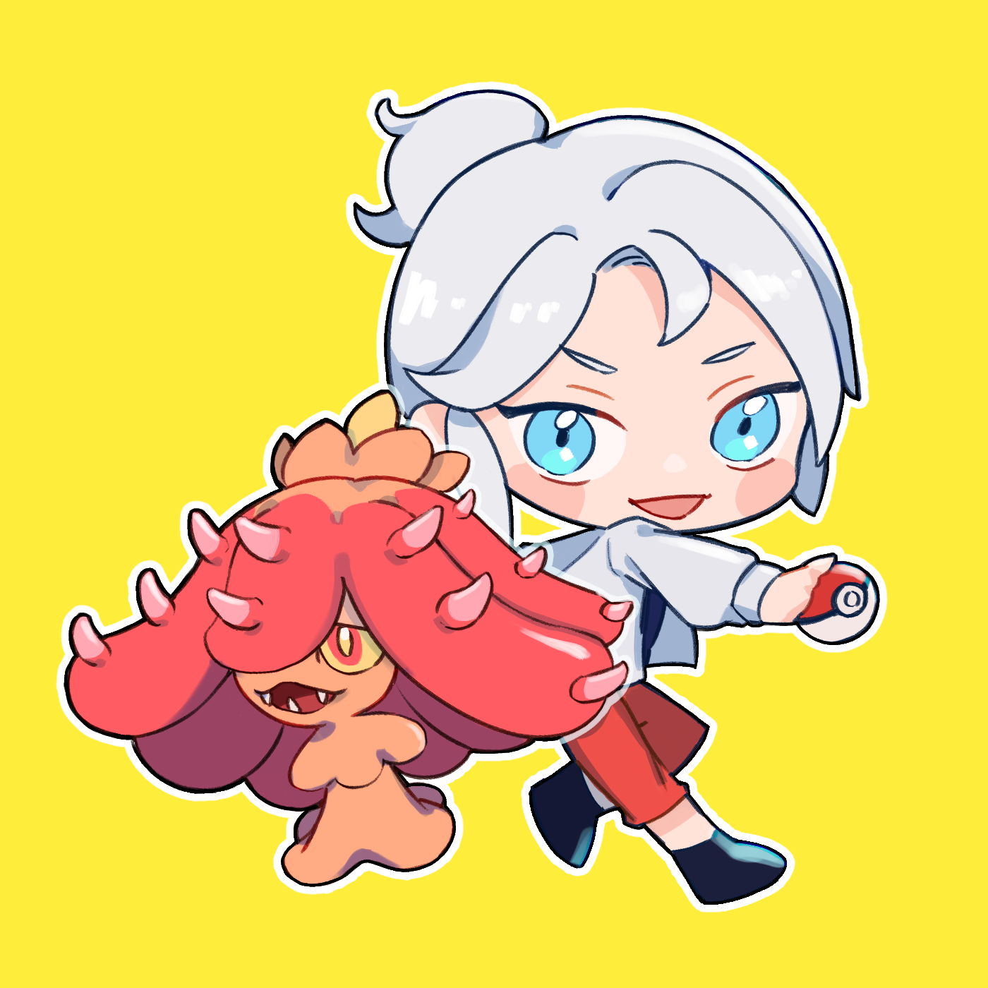 alternate_color animification black_footwear black_shirt blue_eyes boots colored_sclera commentary_request crossover gen_7_pokemon grey_hair grey_jacket highres holding holding_poke_ball jacket jett_(valorant) looking_at_viewer mareanie nanana_(syoki0916) nintendo one_eye_covered open_mouth poke_ball poke_ball_(basic) pokemon pokemon_(creature) ponytail red_eyes red_shorts shiny_pokemon shirt shorts simple_background smile v-shaped_eyebrows valorant yellow_background yellow_sclera