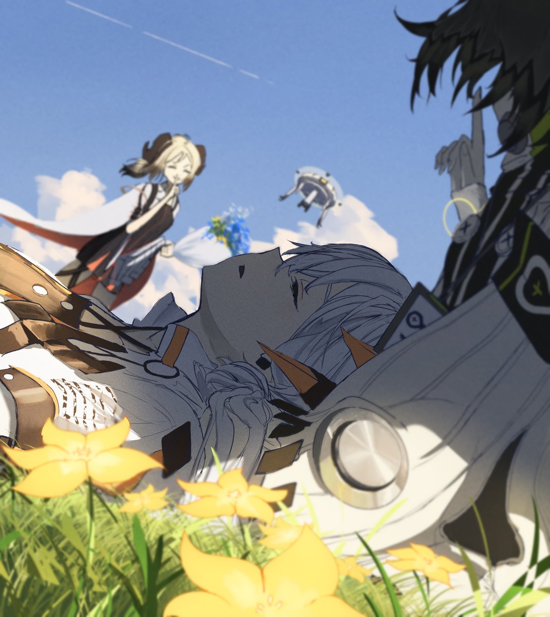 3girls arknights blonde_hair blurry blurry_background bouquet finger_to_mouth flower highres holding holding_bouquet horns ifrit_(arknights) multiple_girls nnikigoma ptilopsis_(arknights) rhine_lab_family_(arknights) saria_(arknights) shushing sleeping white_hair