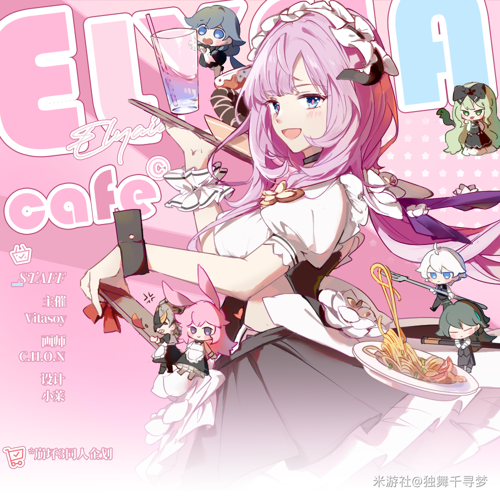 3boys 4girls ahoge anger_vein animal_ears black_bow black_bowtie black_dress blue_eyes bow bowtie character_name chibi closed_eyes cover crossdressing crossdressing_(mtf) dress drink duwu_qian_xun_meng elysia_(honkai_impact) elysia_(miss_pink)_(honkai_impact) elysia_(miss_pink_elf)_(honkai_impact) fake_horns fake_magazine_cover food fox_ears fox_girl from_side fu_hua green_hair grey_hair hair_ribbon heart holding holding_plate honkai_(series) honkai_impact_3rd horns kalpas_(honkai_impact) kevin_kaslana long_hair looking_at_viewer magazine_cover maid maid_headdress male_maid mask mask_on_head miyoushe_watermark mobius_(honkai_impact) multiple_boys multiple_girls official_alternate_costume open_mouth pasta pink_hair plate ribbon short_hair spaghetti su_(honkai_impact) watermark white_hair yae_sakura yae_sakura_(goushinnso_memento)