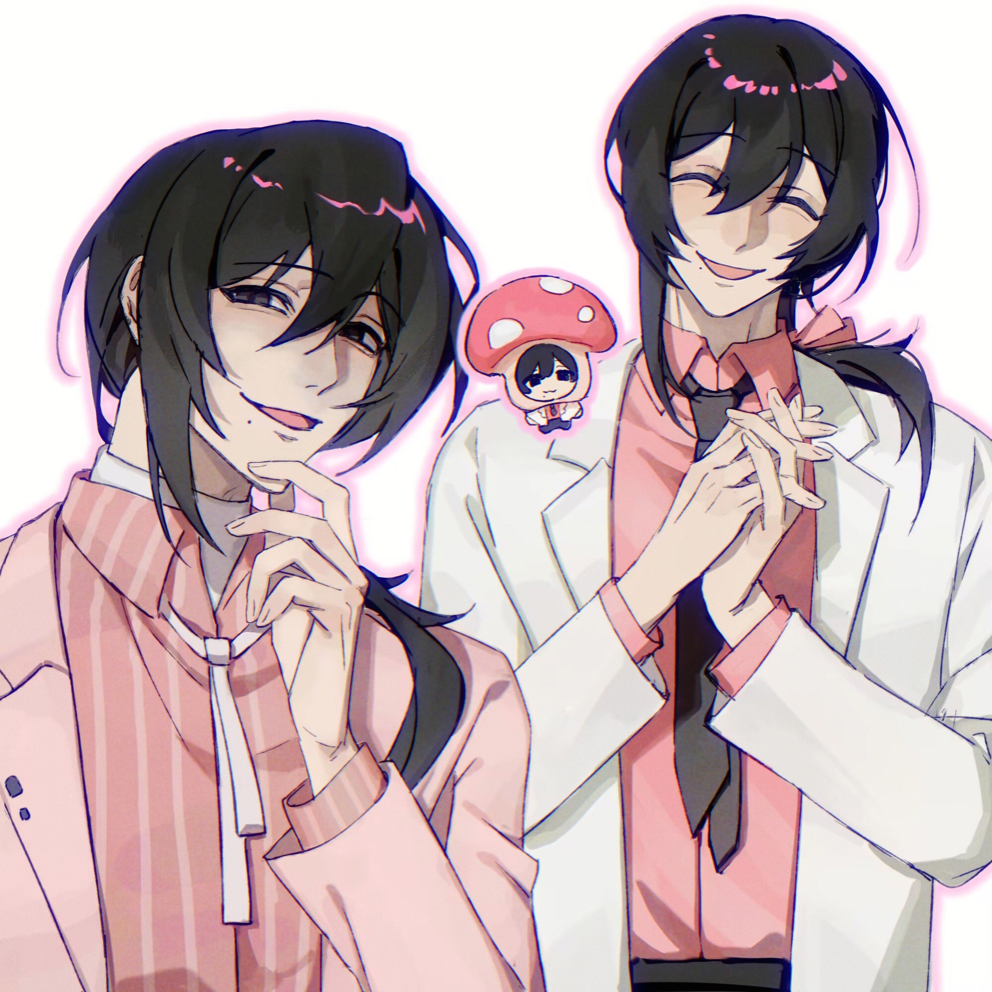1boy :3 black_hair black_necktie black_pants bo_li_wei_shubing chinese_commentary chromatic_aberration closed_eyes closed_mouth collared_shirt commentary_request hair_between_eyes hair_ribbon head_tilt highres jacket lab_coat lapels long_sleeves male_focus mo_chengwei mole mole_under_mouth multiple_views mushroom_hat neck_ribbon necktie open_clothes open_jacket open_mouth outline own_hands_together pants pink_jacket pink_outline pink_ribbon pink_shirt ribbon shirt simple_background smile striped_clothes striped_shirt touqi_guaitan turtleneck vertical-striped_clothes vertical-striped_shirt white_background white_ribbon