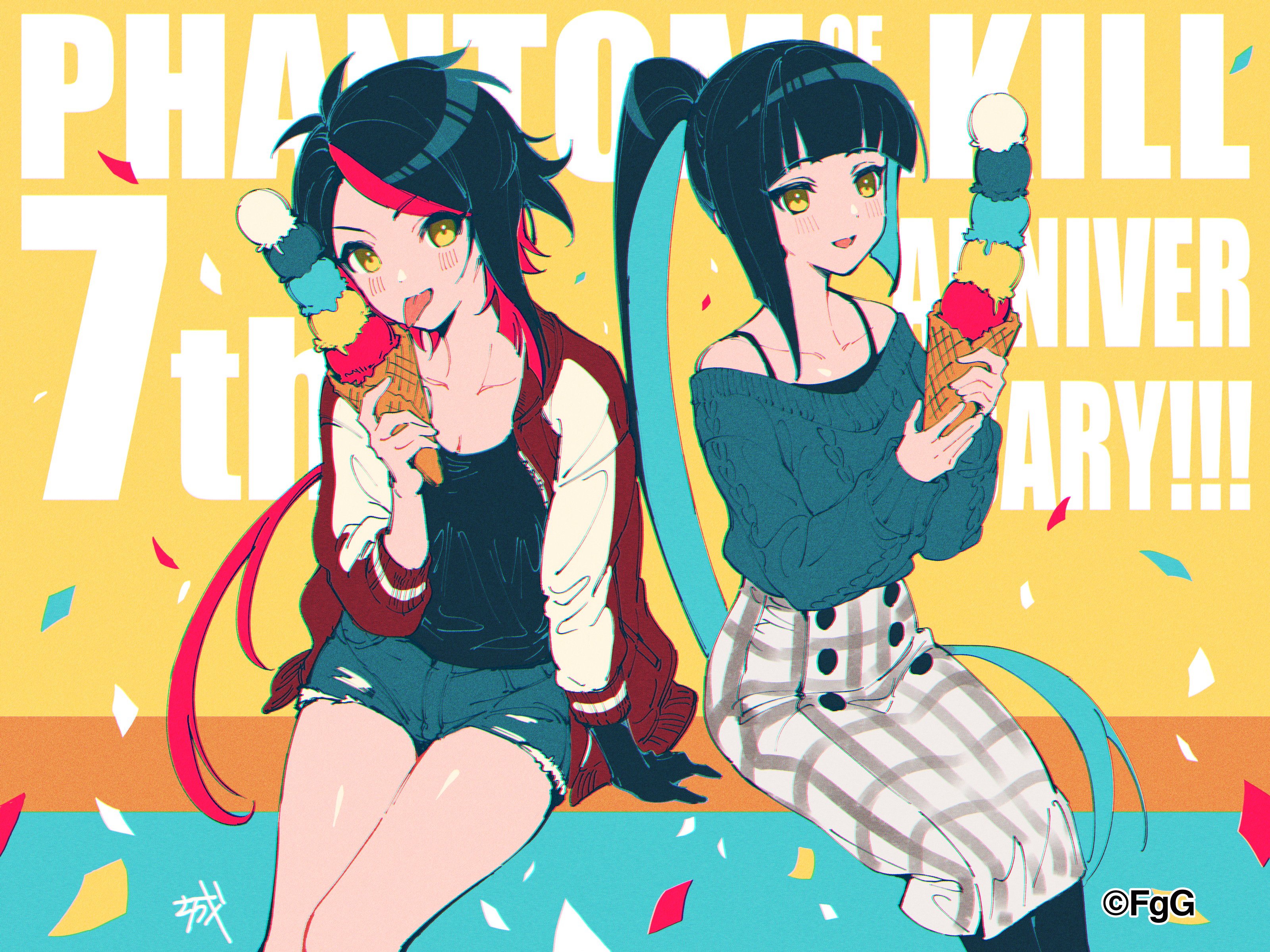 :d absurdres arm_support artist_name black_gloves black_hair blunt_bangs colored_inner_hair confetti denim denim_shorts food gloves grey_skirt high_ponytail highres holding holding_food holding_ice_cream hyoha_(phantom_of_the_kill) ice_cream jacket long_hair long_sleeves looking_at_food looking_at_viewer multicolored_hair official_art open_mouth phantom_of_the_kill ponytail red_hair second-party_source shiro_(castle.gumi) shorts single_glove sitting skirt smile streaked_hair suiha_(phantom_of_the_kill) tongue tongue_out very_long_hair yellow_eyes
