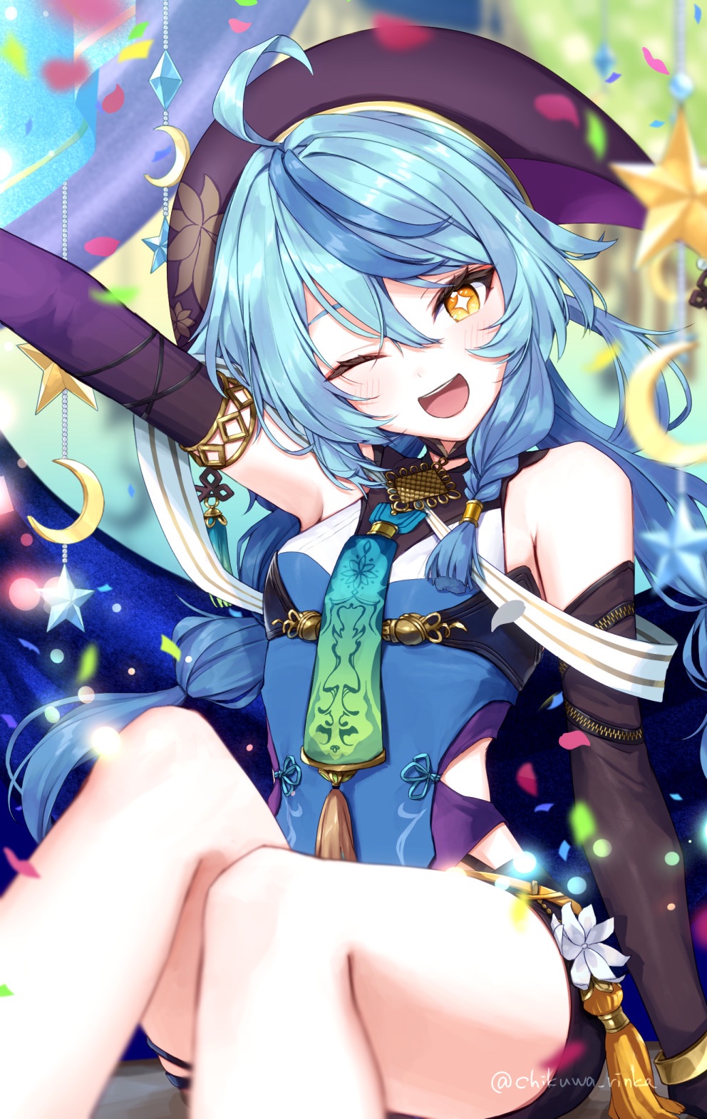1girl ahoge blue_hair chikuwa_(rinka) hair_between_eyes hair_ornament hat highres looking_at_viewer nijisanji one_eye_closed orange_eyes smile tamanoi_nana virtual_youtuber yellow_eyes