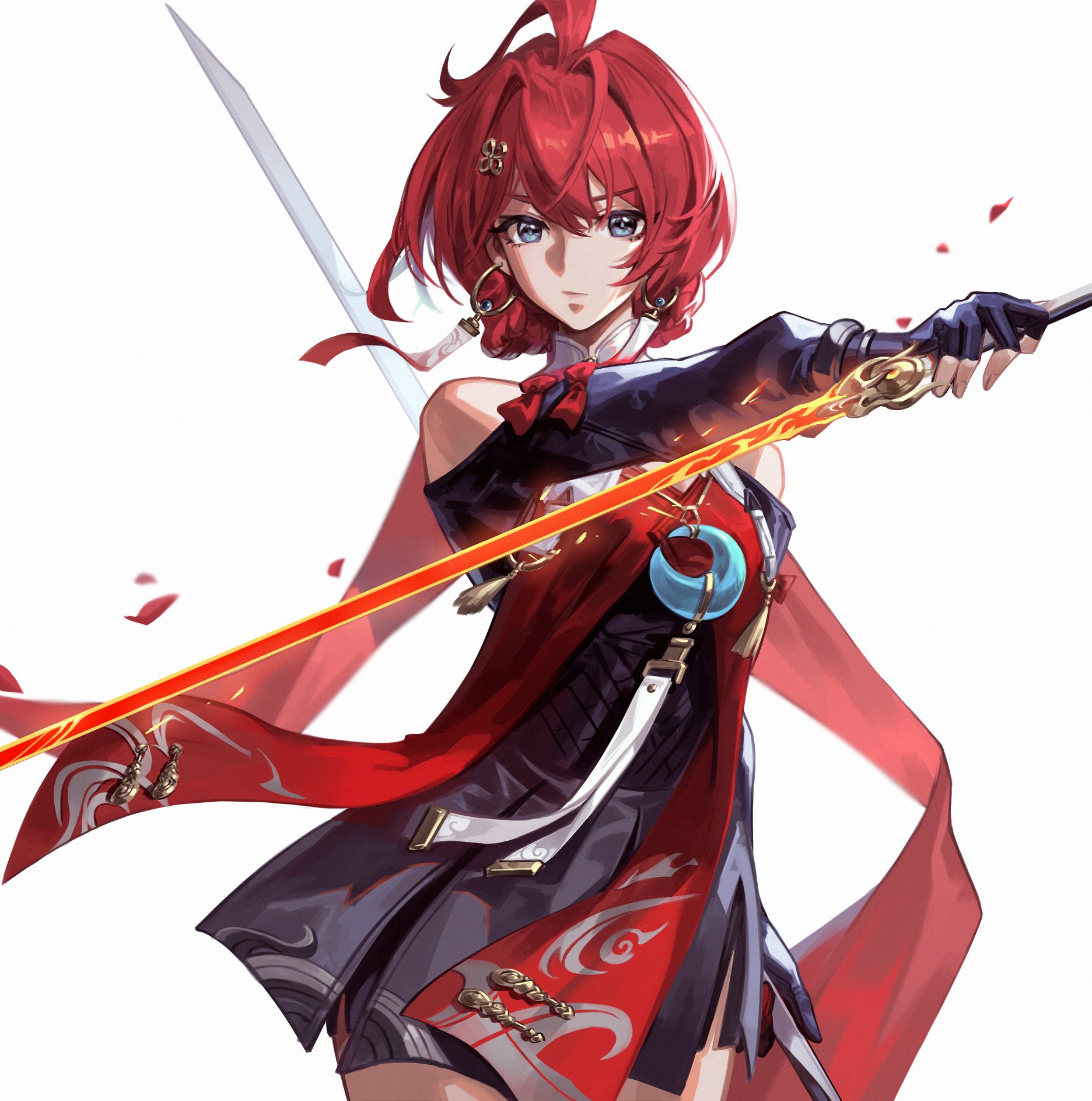 1girl asymmetrical_dual_wielding bare_shoulders black_gloves black_shirt black_shorts blue_eyes breasts clothing_cutout collar commentary cowboy_shot danjin_(wuthering_waves) dual_wielding earrings english_commentary fingerless_gloves gloves hair_between_eyes hair_ornament highres holding hoop_earrings jewelry looking_at_viewer medium_breasts red_hair shirt shorts shoulder_cutout simple_background single_fingerless_glove solo steve_zheng white_background white_collar wuthering_waves yunjian