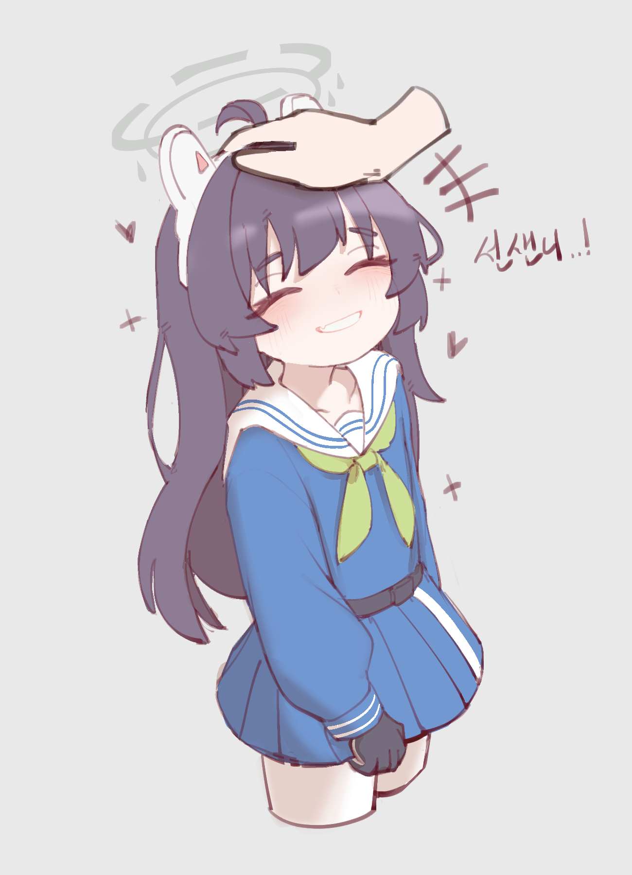 1boy 1girl animal_ears black_gloves black_hair blue_archive blue_serafuku blue_skirt closed_eyes cropped_legs cyan9322 fake_animal_ears gloves green_neckerchief grey_background grey_halo grin halo headpat heart highres long_hair miyu_(blue_archive) neckerchief rabbit_ears school_uniform sensei_(blue_archive) serafuku simple_background skirt smile