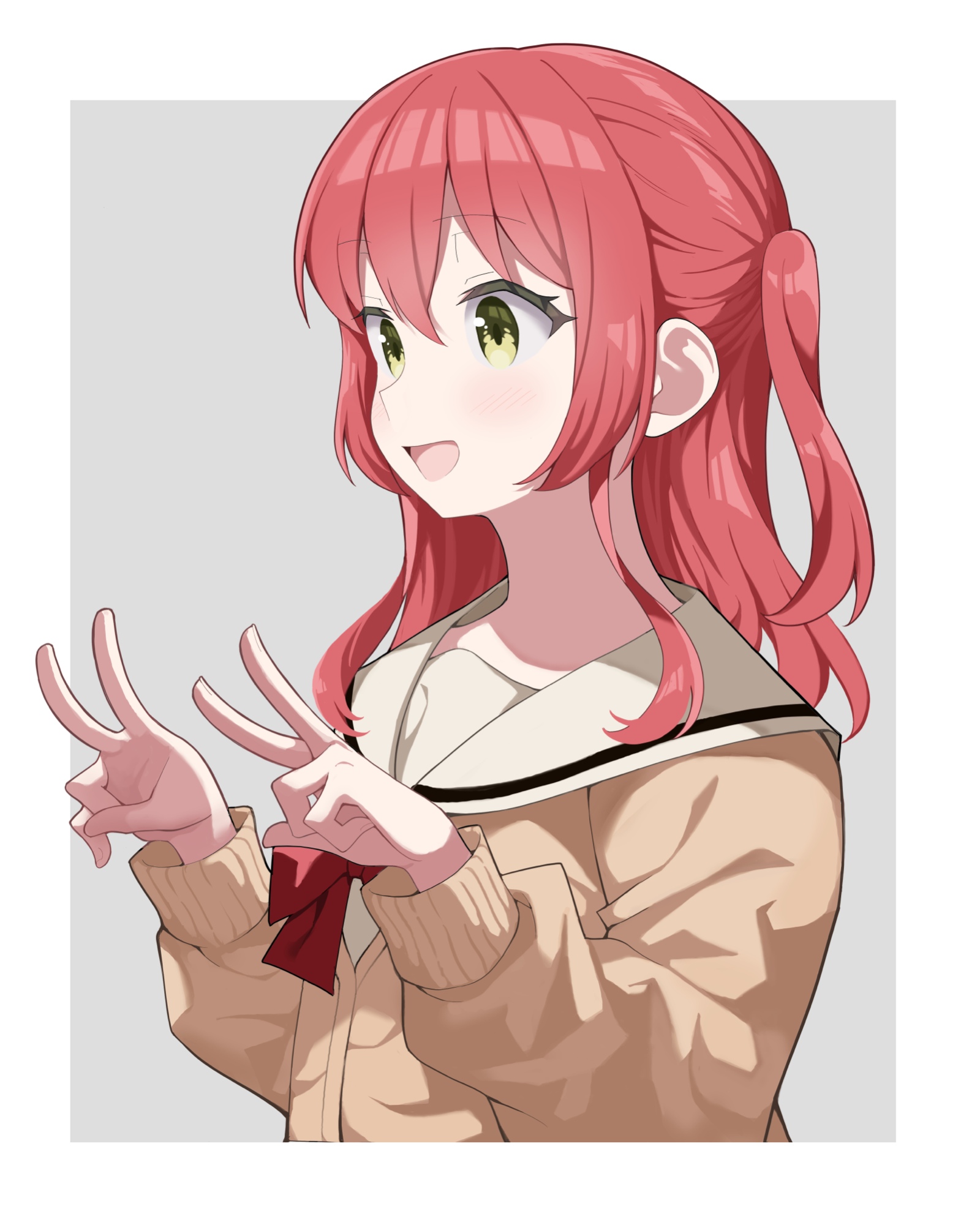 1girl bocchi_the_rock! double_v green_eyes hair_ornament highres kita_ikuyo long_hair long_sleeves one_side_up open_mouth red_hair school_uniform simple_background v yuu_(shampoohatslime)