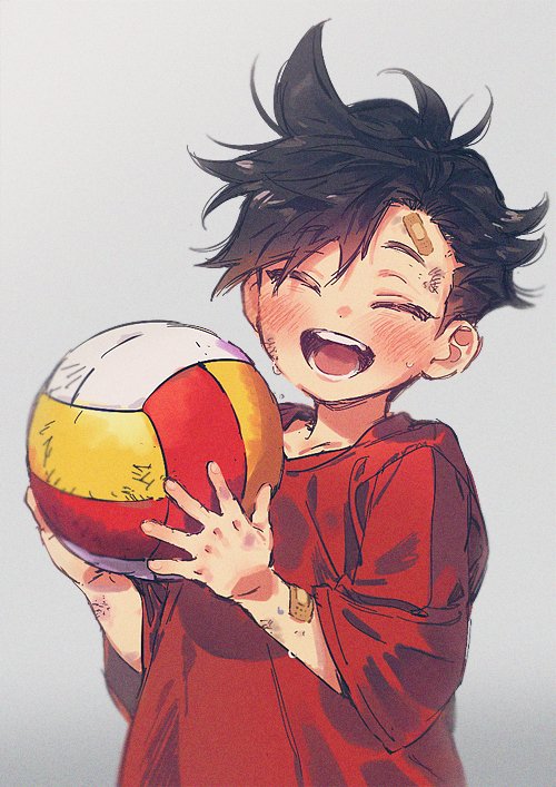 1boy baggy_clothes ball bandaid bandaid_on_arm bandaid_on_face bandaid_on_forehead bangoul black_hair blush child closed_eyes crew_neck haikyuu!! holding holding_ball kuroo_tetsurou male_focus messy_hair open_mouth red_shirt shirt short_hair short_sleeves simple_background solo t-shirt teeth upper_body volleyball_(object) white_background